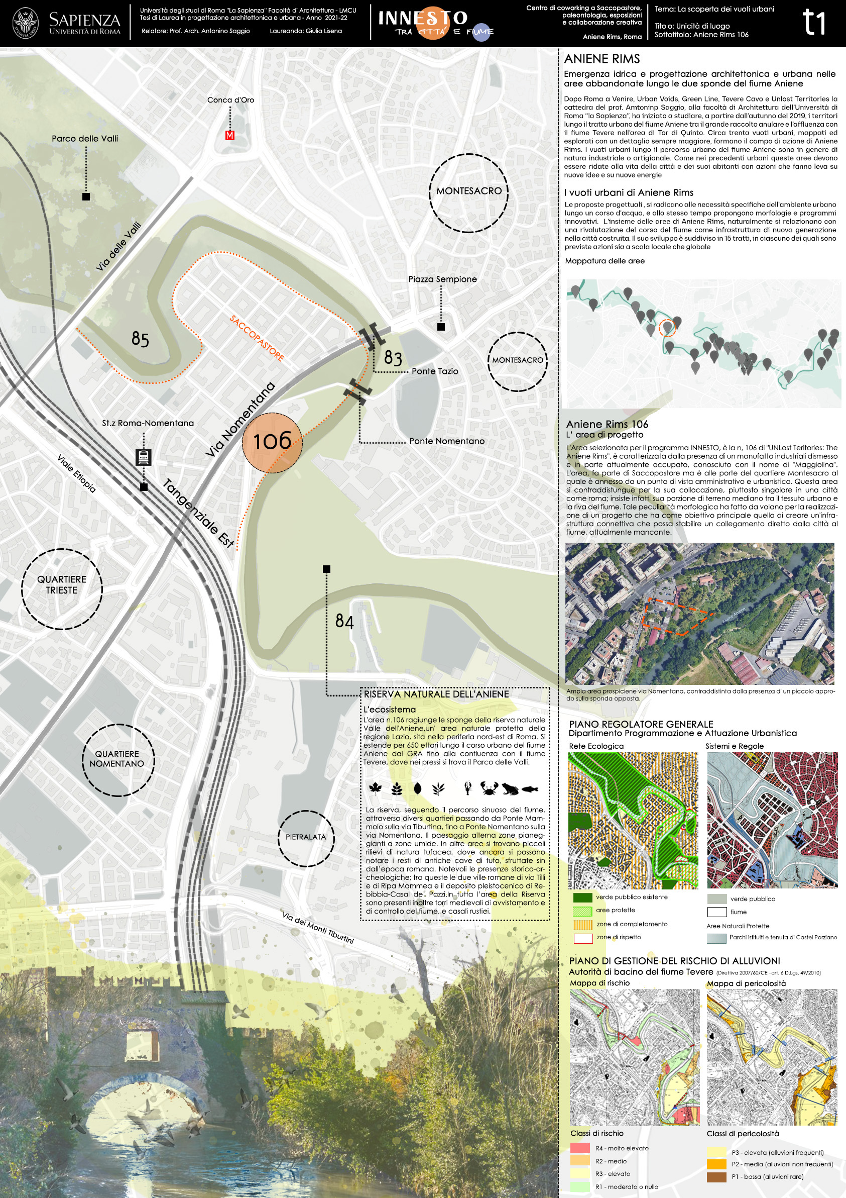 Elemento imprescindibile per comprendere le scelte compositive, sono le caratteristiche urnbane e morfologiche dell’area. Il vuoto urbano selezionato per INNESTO (il 108 di Aniene rims) rientra insieme a Montesacro nel III Municipio. L’ansa del fiume disegna i confini naturali della “sacca” del quartiere di Saccopastore che risulta chiusa su tre lati, mentre il quarto si apre verso il quartiere Trieste. Via Nomentana è la grande arteria di collegamento che lo attraversa in senso longitudinale e ne garantisce i collegamenti ovest-est.