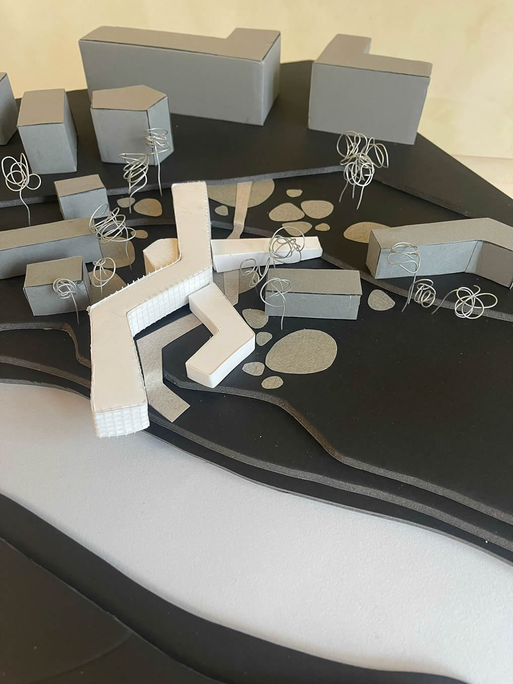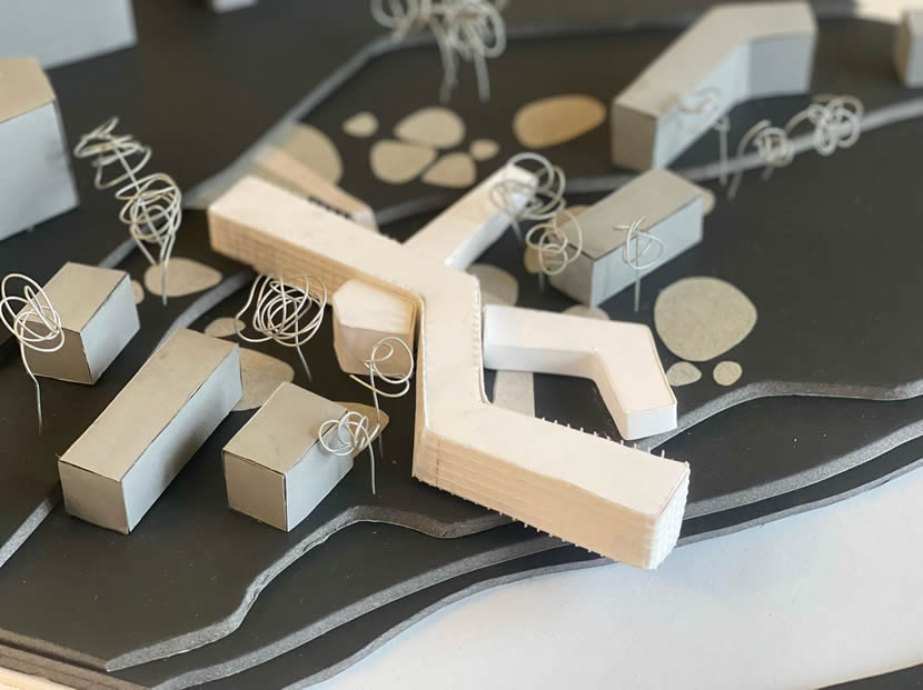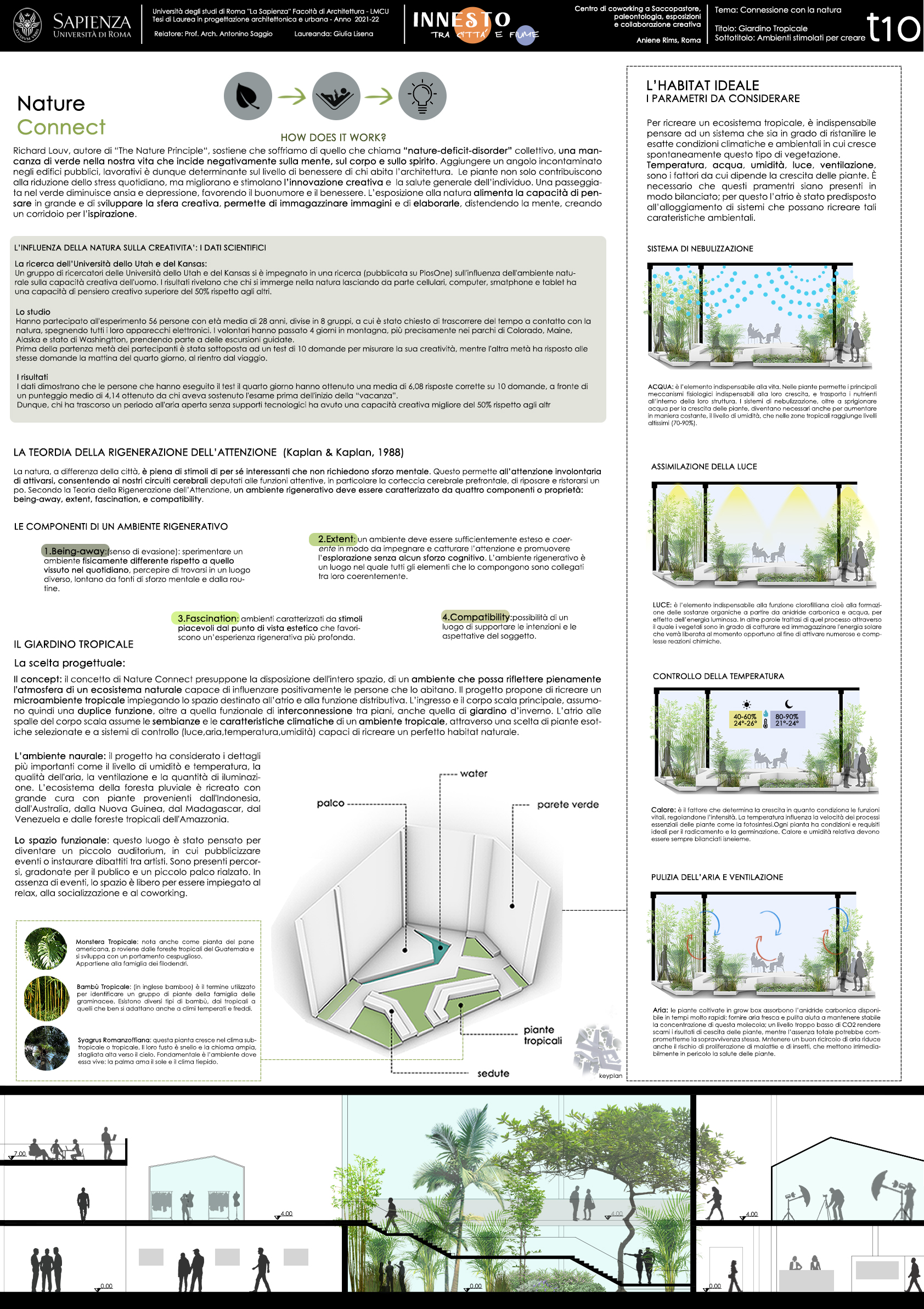La peculiarità morfologica dell'area ha fatto da volano per la realizzazione di un progetto che ha naturalmente ha quaale obiettivo principale creare un'infrastruttura che possa stabilire un collegamento diretto tra città e fiume. Il processo compositivo ha visto in successione tre macroazioni: la rimozione della presistenza, il tracciamento dell’asse di collegamento città-fiume, la realizzazione di un volume dalla forte vovazone infrastrutturale, un “innesto” appunto che consenta di allacciare in maniera armoniosa la riva al livello urbano e viceversa. L'edificio risponde quindi con forza al principio dell "'infrastructuring" posta alla base di tutti i progetti Aniene Rims, ma che qui trova una declinazione particolrmente evidente.