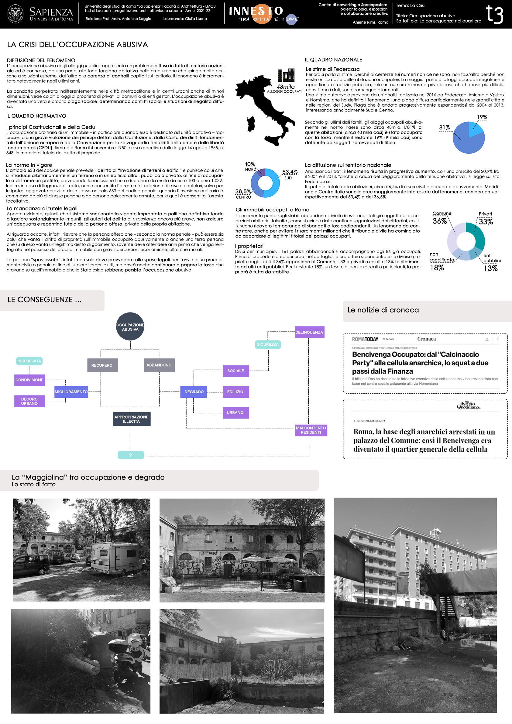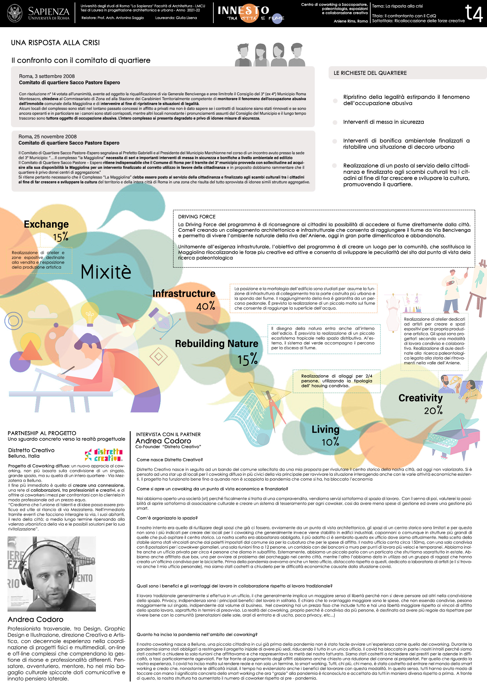 L’area di progetto in questo contesto generale risulta particolarmente strategica: insiste infatti su una porzione di terreno che si presenta come un tessuto intermedio tra il mondo urbano e quello naturale lungo il quale scorre l'Aniene. In questo intervallo di suolo insiste, come si diceva la “Maggiolina”, manufatto industriale dismesso, occupato e in grave stato di degrado. Sebbene il fiume sia nelle immediate vicinanze del tessuto urbano, la preesistenza crea un incombente ostacolo fisico e visivo al raggiungimento della riva, tanto da renderla inaccessibile e completamente nascosta. Il fiume è così un valore solo "potenziale", assente e rimosso nella realtà della vita pubblica.