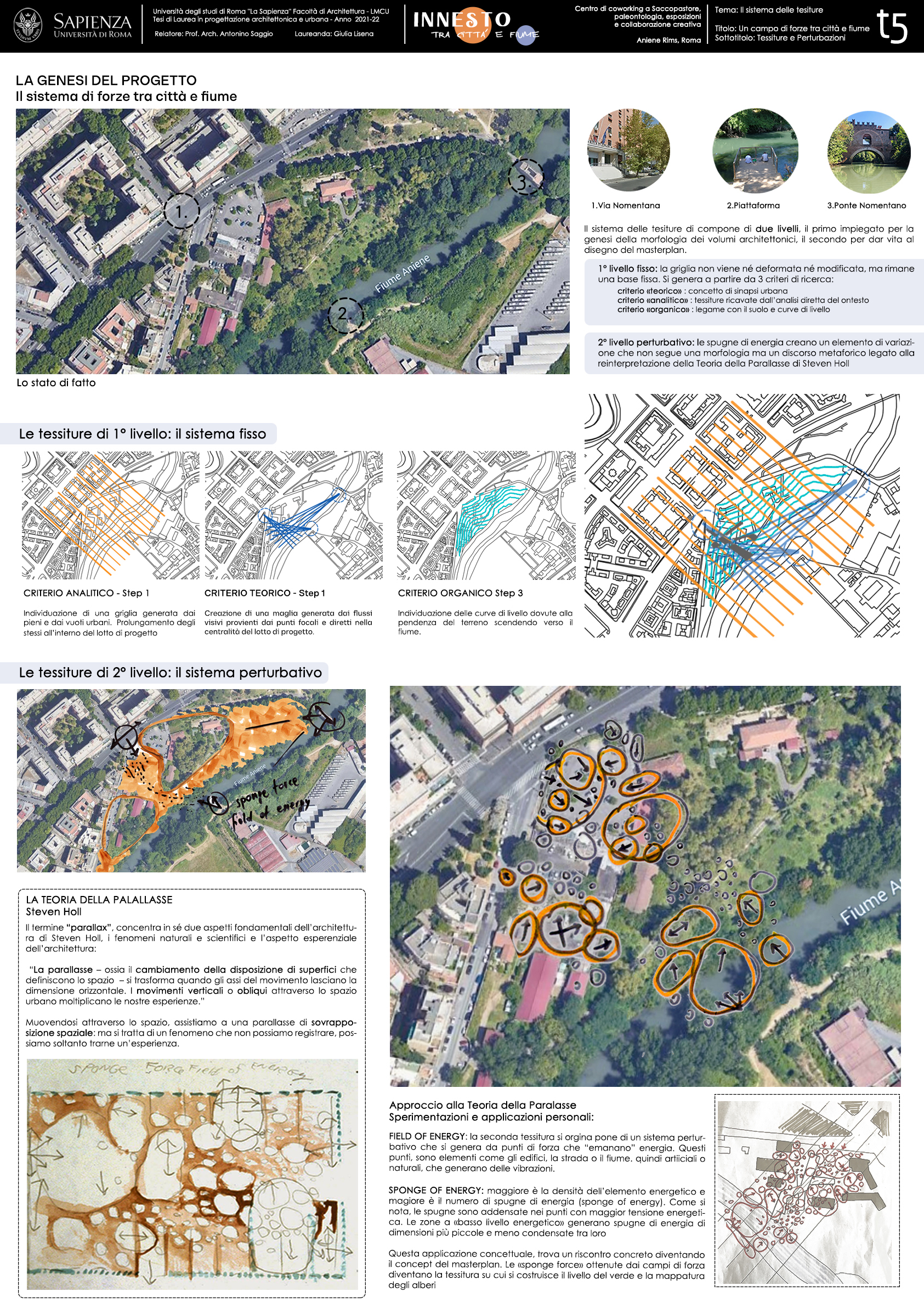 Il masterplan nasce dalla rivisitazione del concetto di Parallax di Steven Holl. Il disegno si basa su un sistema di tessiture "perturbativa", in cui esistono dei “field of energy” (o punti di forza) che “emanano” energia. Questi punti, associati nel progetto negli edifici, nella strada e nel fiume, generano delle vibrazioni. Da questi punti nascono delle “sponge of energy”; spugne di forza il cui criterio di nascita, morfologia, ampiezza e densità dipende dal livello di energie emanato dai field of energy.