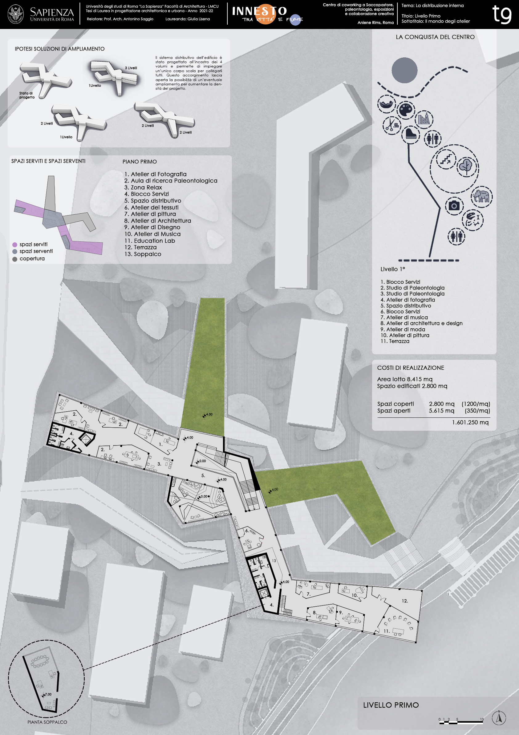 In ultimo, per quanto concerne il programma, INNESTO offre la possibilità di affittare atelier per la produzione creativa, spazi espositivi per la mostra e la vendita e spazi di studio per la ricerca. L’idea è quella di introdurre un nuovo approccio al Co-working, non più basato sulla condivisione di un singolo grande spazio, ma nella dotazione di tanti piccoli spazi inseriti all’interno di un progetto più ampio, ipotesi verificata insieme ad altre con Andrea Codoro, del distretto creativo di Belluno. Il fine più immediato è quello di creare una connessione, una rete di collaborazioni tra professionisti e creativi e di offrire ai coworker, spazi e strumenti per confrontarsi e aprirsi al quartiere. Il programma prevede inoltre uno spazio di esclusiva destinato alla ricerca paleontologica di Saccopastore, con lo scopo di fare ricerca e soprattutto promuovere la Valle dell’Aniene nella veste poco conosciuta di grande miniera di depositi e reperti fossili.