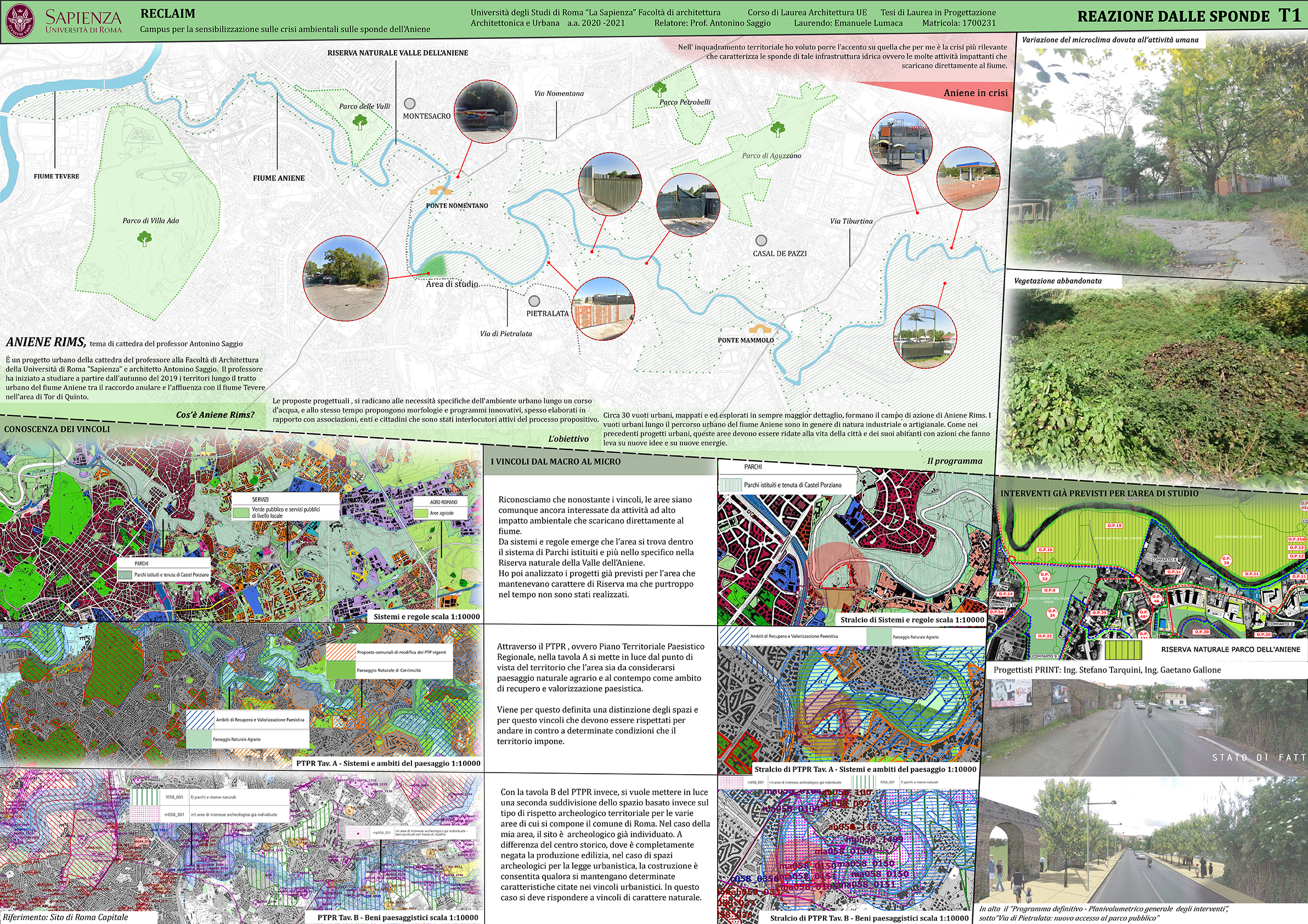 Il complesso Reclaim si inserisce nella Riserva naturale della valle dell’Aniene a diretto contatto del fiume. L’obiettivo principale del progetto è contribuire a ripristinare l’ecosistema fluviale attualmente molto compromesso tanto di fare della denominazione “Riserva naturale” una indicazione che non trova nei fatti una efficace esistenza. In gran parte delle sponde e nell’area del progetto è presenta una vegetazione infestante e molti altri fattori inquinanti e nocivi tra cui l’attuale presenza nell’area di un impianto di autodemolizione.