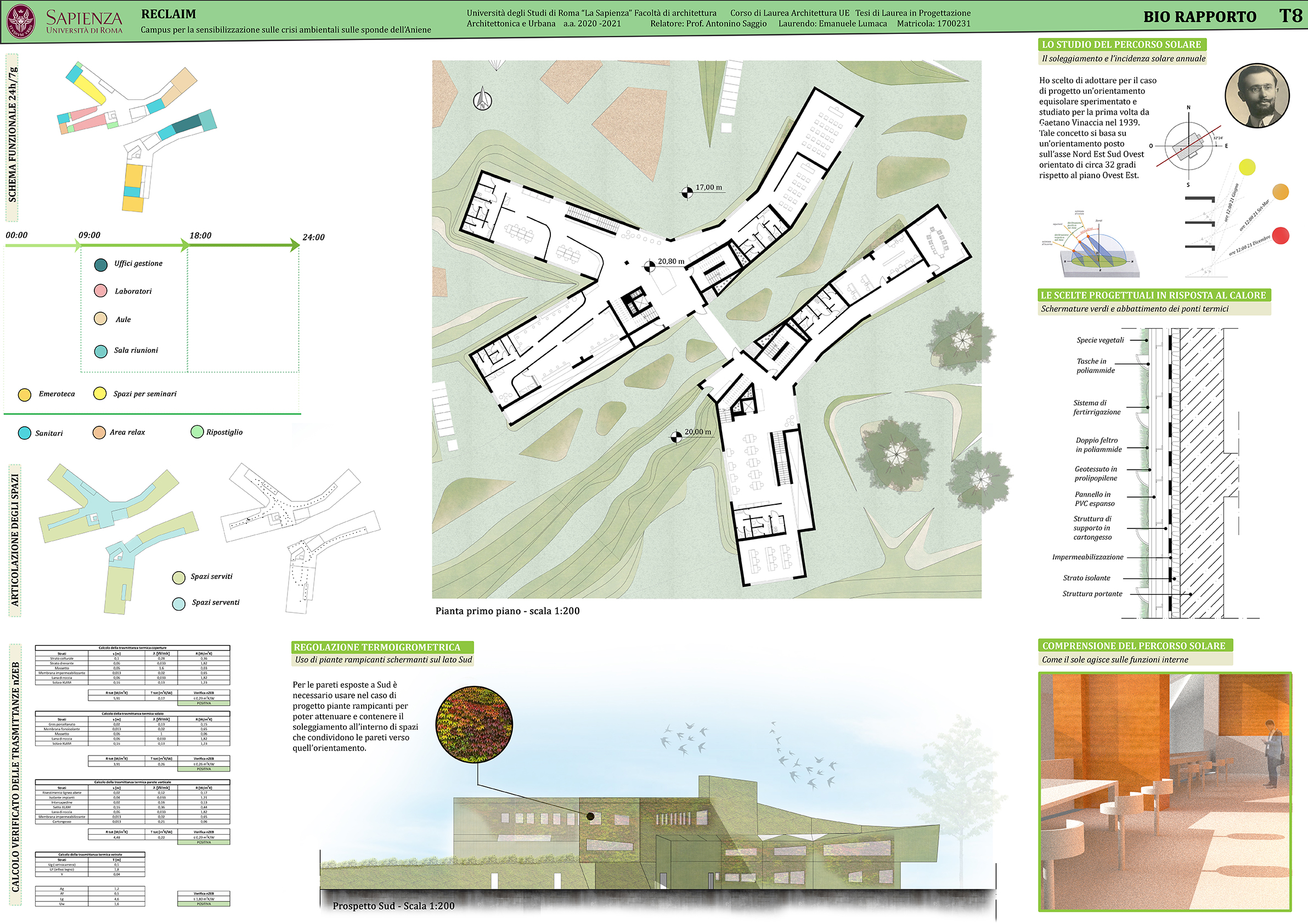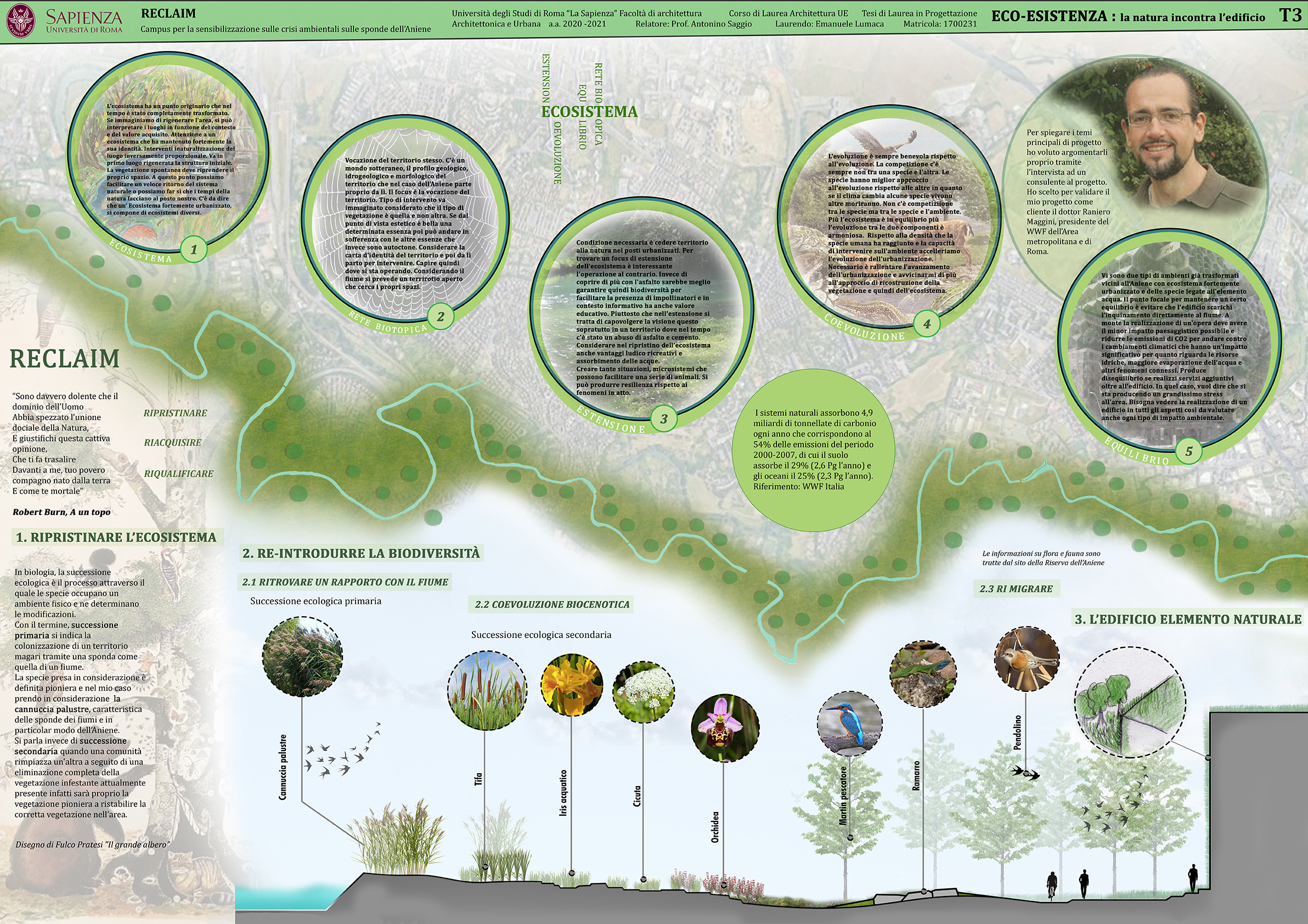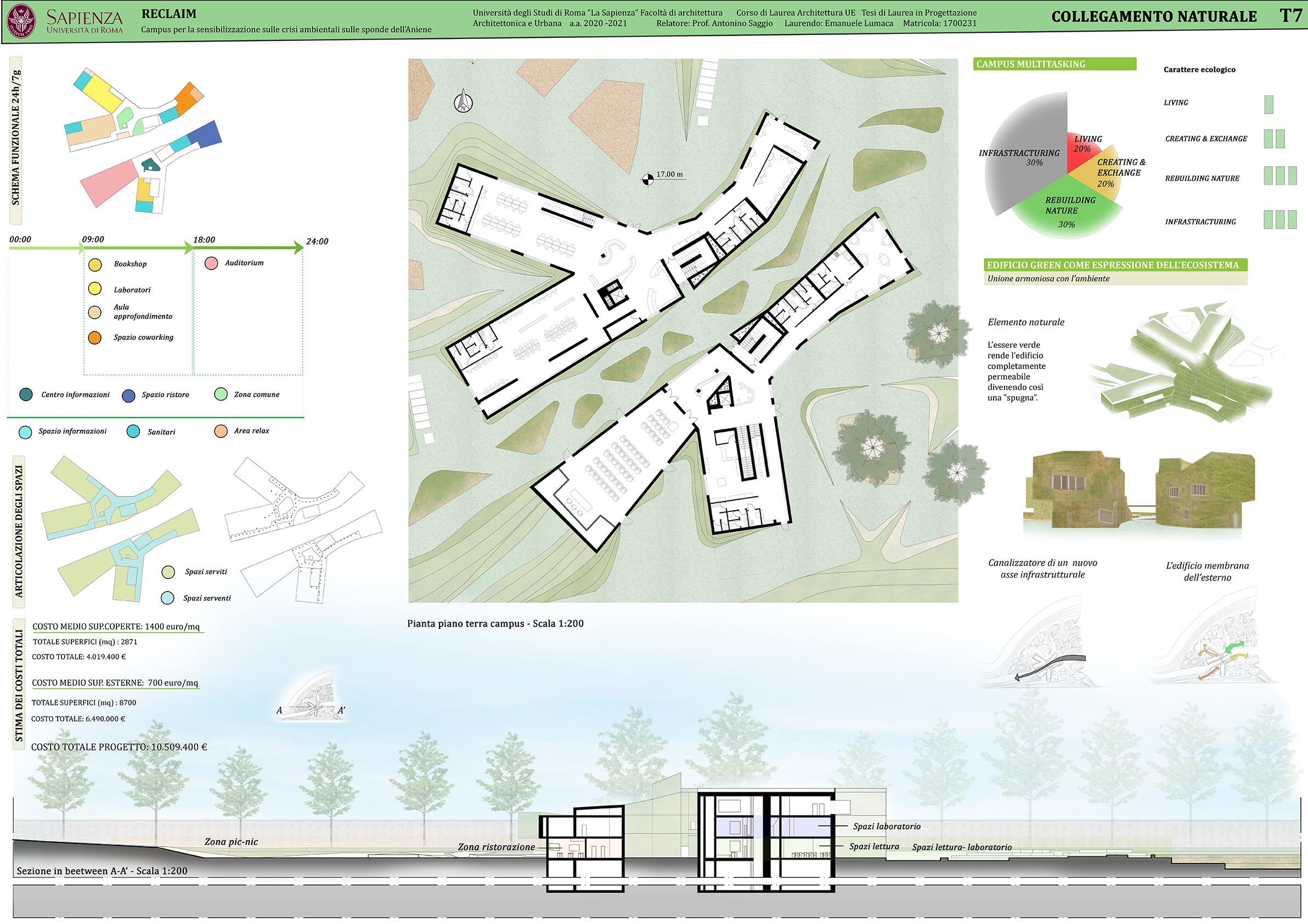 Il progetto si pone come occasione di “disinquinamento” attraverso il suo stesso programma funzionale, elaborato con il supporto di una lunga conversazione con il dr. Raniero Maggini presidente del WWF Roma e area metropolitana, con la creazione di un piccolo campus per “La sensibilizzazione sulle crisi ambientale sulle sponde dell’Aniene”. Oltre alle zone all’aperto si prevede un piccolo edificio nella parte meridionale con laboratori, aule di studio, auditorium, coworking, libreria sul tema. L'edificio è costruito con modalità molto attente al consumo energetico nZEB (nearly Zero Energy Building) con particolare attenzione alle trasmittanze dei pacchetti che definiscono l’involucro edilizio e il fabbisogno energetico soddisfatto dalle energie prodotte tramite fonti rinnovabili. La modesta cubatura, il cintrollo idrico, la funzione ambientale e disinquinante di Reclaim rappresentano nel loro insieme caratteristiche congrue con le indicazioni di Piano Regolatore.