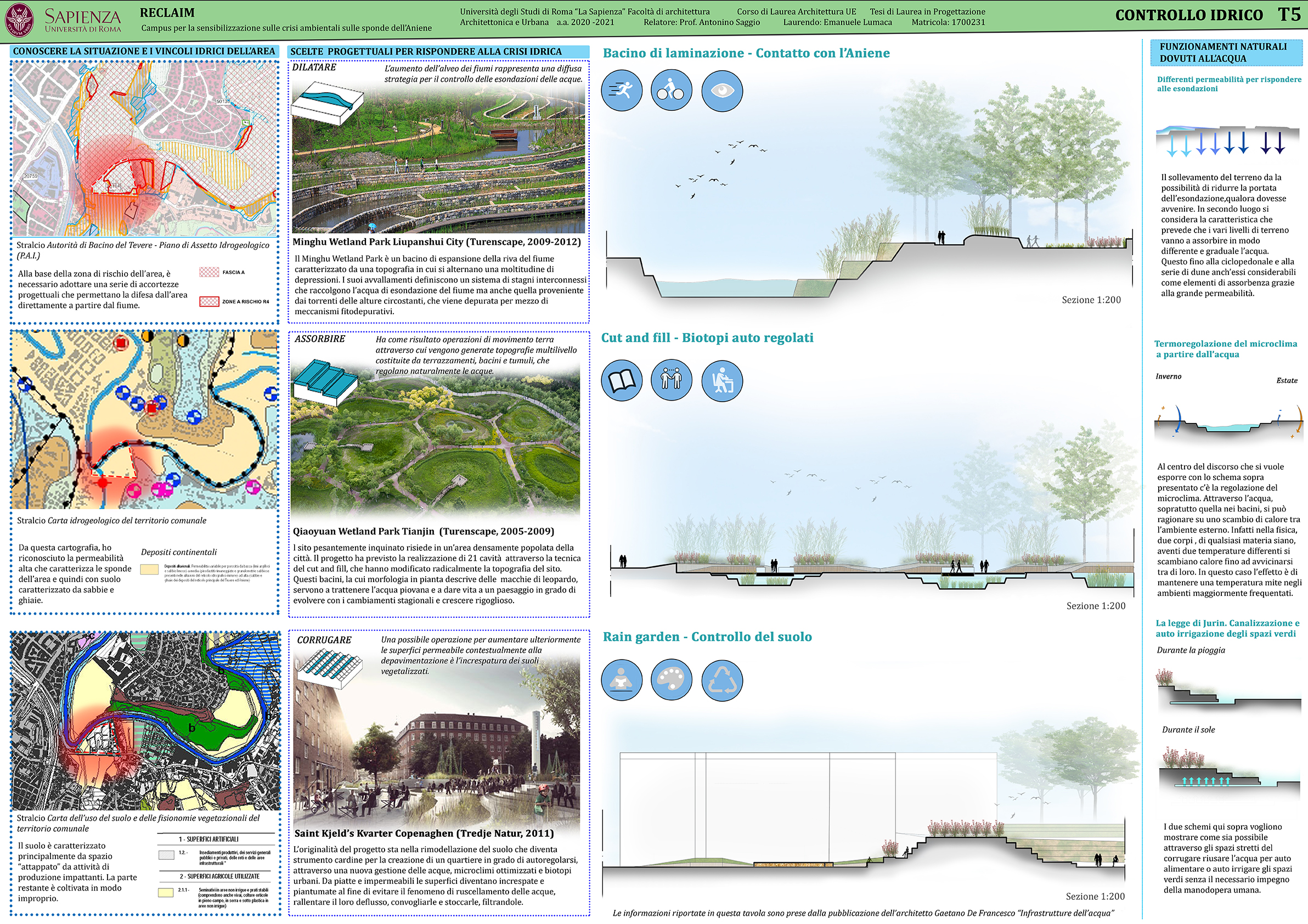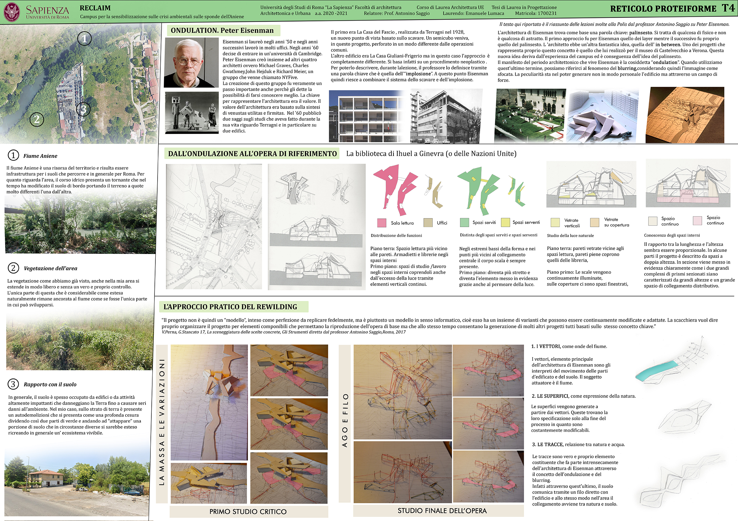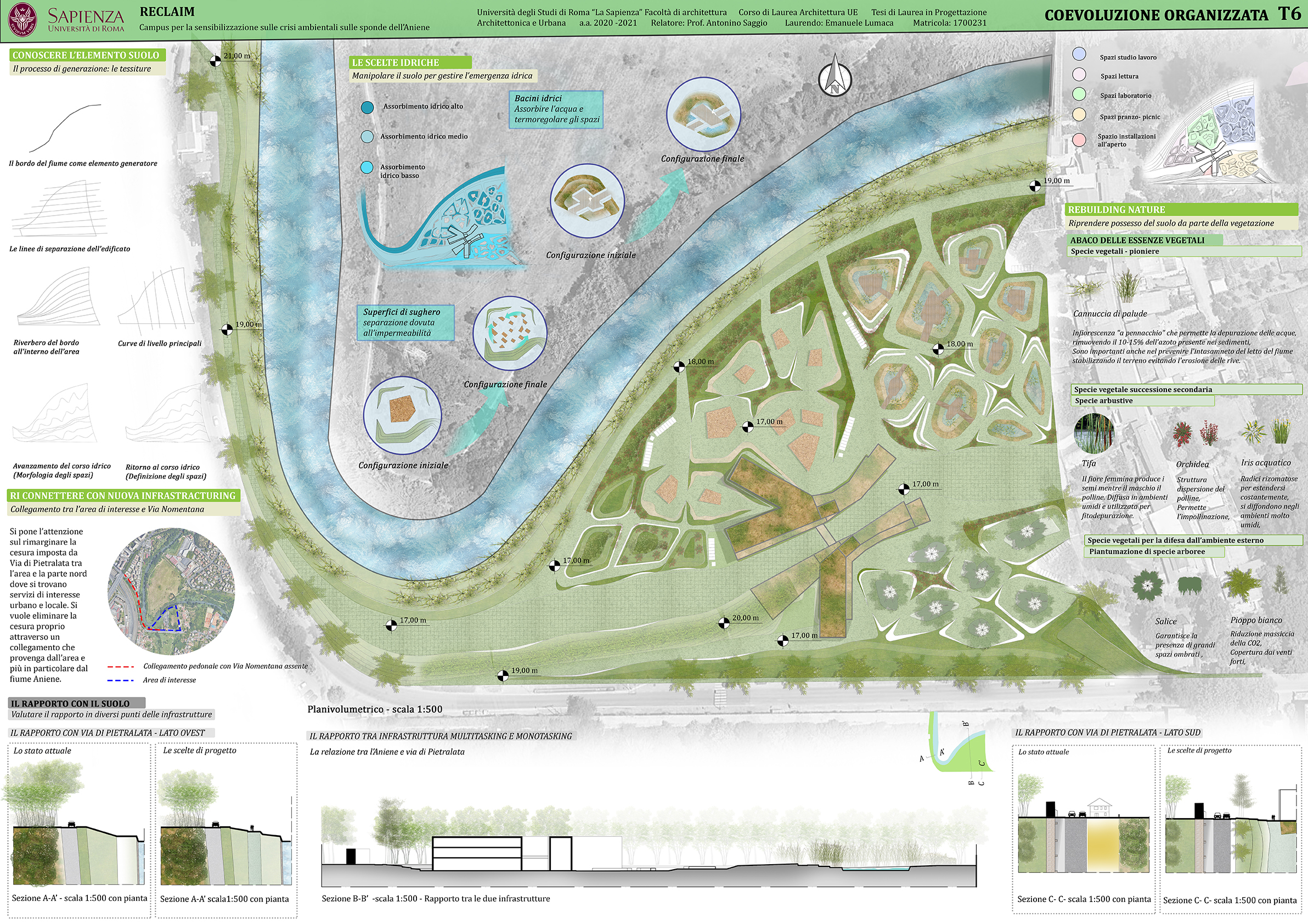 Il progetto si pone come occasione di “disinquinamento” attraverso il suo stesso programma funzionale, elaborato con il supporto di una lunga conversazione con il dr. Raniero Maggini presidente del WWF Roma e area metropolitana, con la creazione di un piccolo campus per “La sensibilizzazione sulle crisi ambientale sulle sponde dell’Aniene”. Oltre alle zone all’aperto si prevede un piccolo edificio nella parte meridionale con laboratori, aule di studio, auditorium, coworking, libreria sul tema. L'edificio è costruito con modalità molto attente al consumo energetico nZEB (nearly Zero Energy Building) con particolare attenzione alle trasmittanze dei pacchetti che definiscono l’involucro edilizio e il fabbisogno energetico soddisfatto dalle energie prodotte tramite fonti rinnovabili. La modesta cubatura, il cintrollo idrico, la funzione ambientale e disinquinante di Reclaim rappresentano nel loro insieme caratteristiche congrue con le indicazioni di Piano Regolatore.