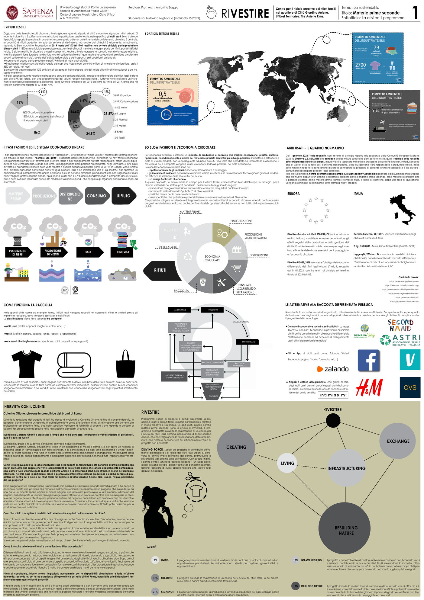 RiVestire è un progetto che si basa sull'idea di trasformare la crisi relativa alle grandi quantità dei rifiuti tessili di oggi, in una risorsa per rilanciare il territorio in modo creativo e sostenibile. Si insedia in un'area strategica nel parco Nomentano di Roma al posto di un edificio industriale abbandonato lungo le rive dell'Aniene, la exfabbrica di cucine Linda. Il progetto propone anche un nuovo disegno di parco che, attraverso scelte paesaggistiche, tenta di ricostruire simbolicamente e morfologicamente la relazione con il fiume della Città giardino Aniene. Una città giardino "capitolina" disegnata con molti elementi di originalità da Gustavo Giovannoni nella Roma del sindaco Ernesto Nathan.