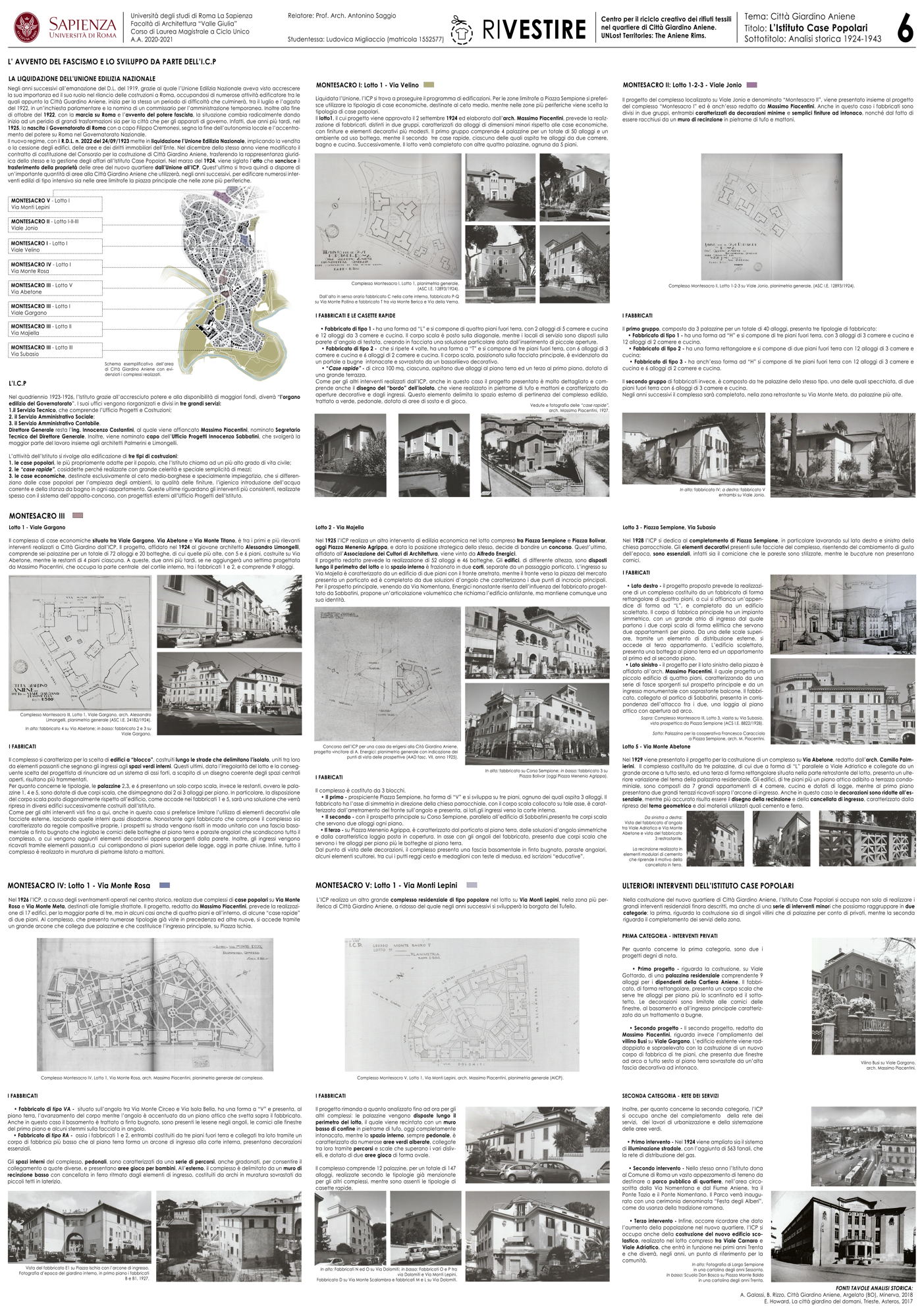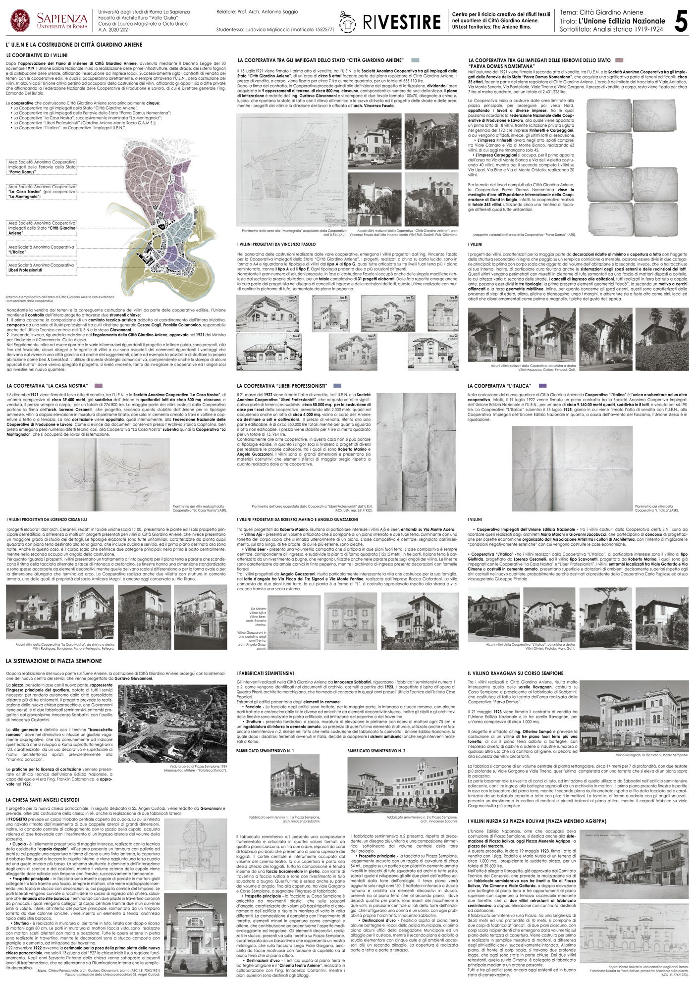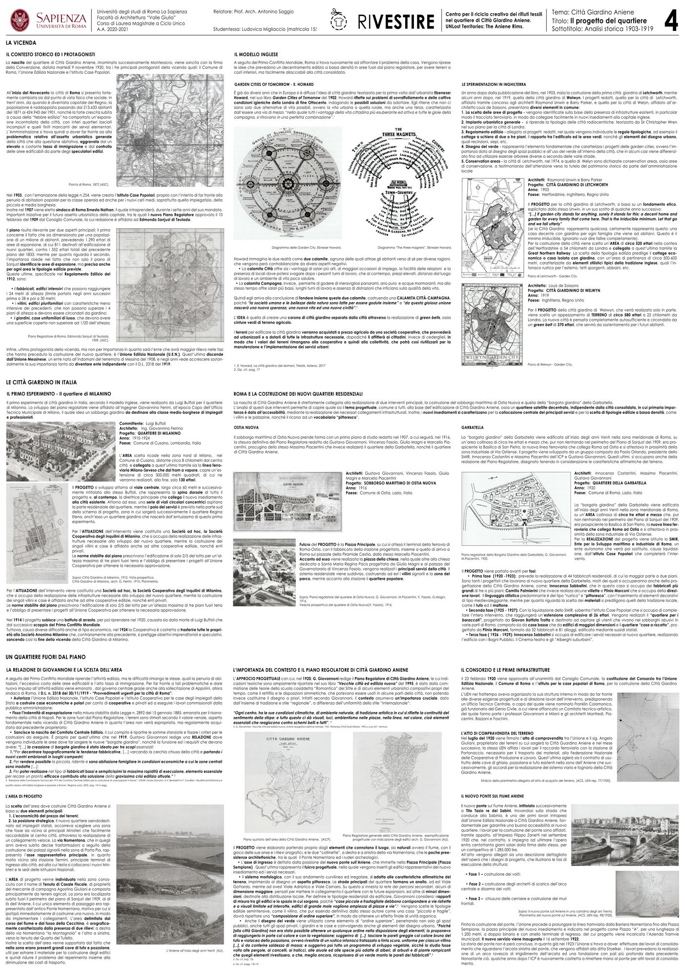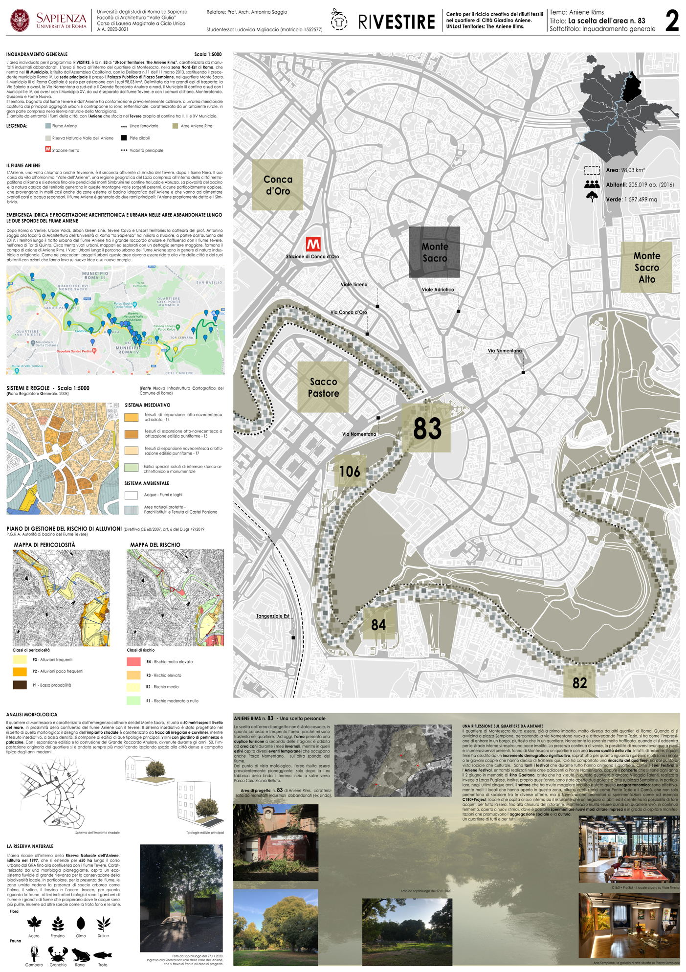 L’area di progetto, caratterizzata da manufatti industriali abbandonati (ex Linda), si trova all’interno del quartiere di Monte Sacro, situato nella zona a nord-est di Roma. La storia del quartiere, la cui vicenda e progetto sono riassunti nelle tavole di analisi storica (tavv. 4, 5, 6 e 7), racconta di un quartiere che fonde insieme i principi della “calamitazione" città-campagna delle Garden Cities of Tomorrow di E. Howard (1902) con le caratteristiche ambientali e morfologiche dell’area, poiché “Ogni centro, ha le sue condizioni climatiche, di ambiente naturale, di tradizione artistica in cui si riflette la continuità del sentimento della stirpe: e tutto questo ci dà visuali, luci, ambientismo nelle piazze, nella linea, nel colore” (G. Giovannoni, Vecchie città ed edilizia nuova, 1931).