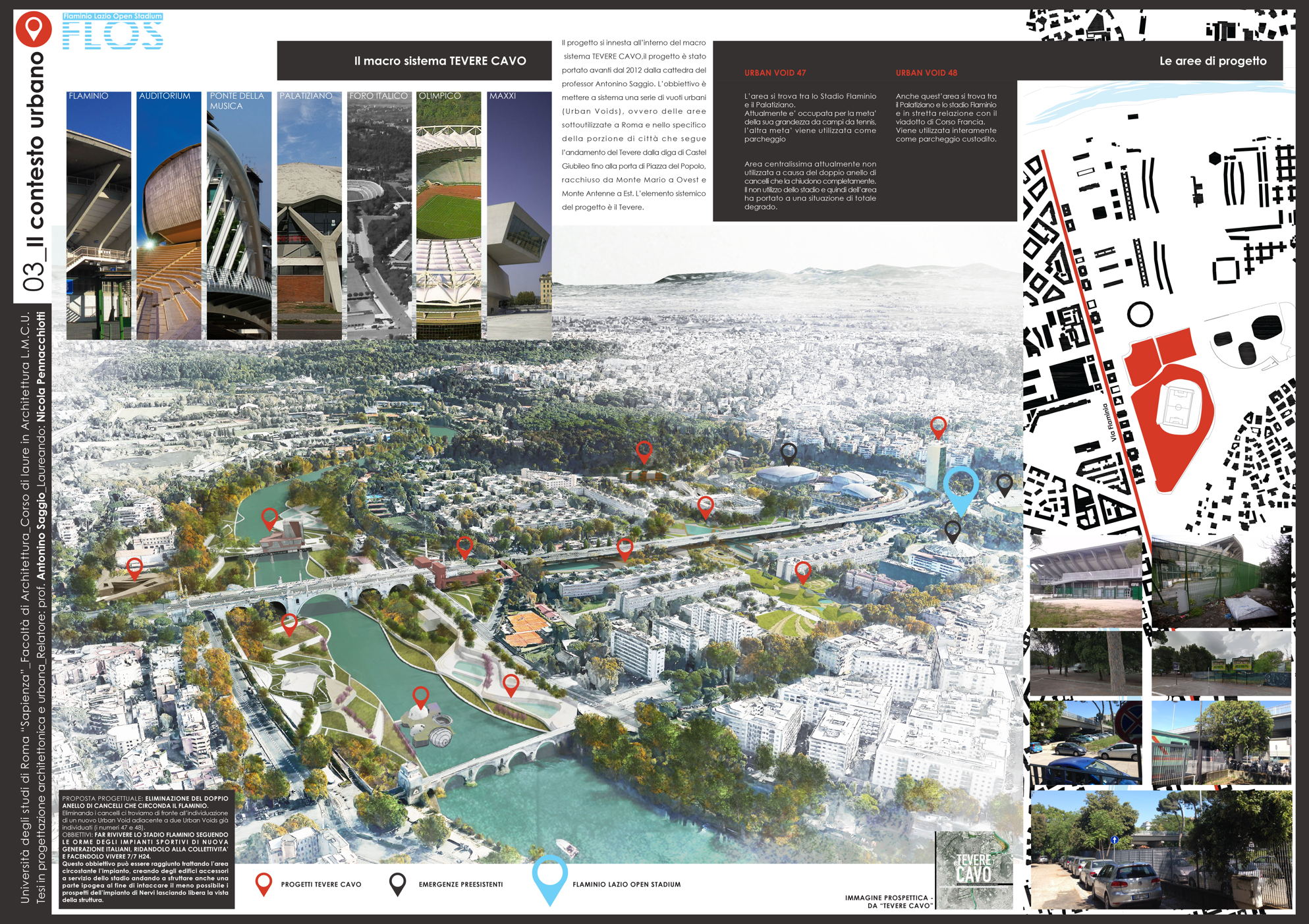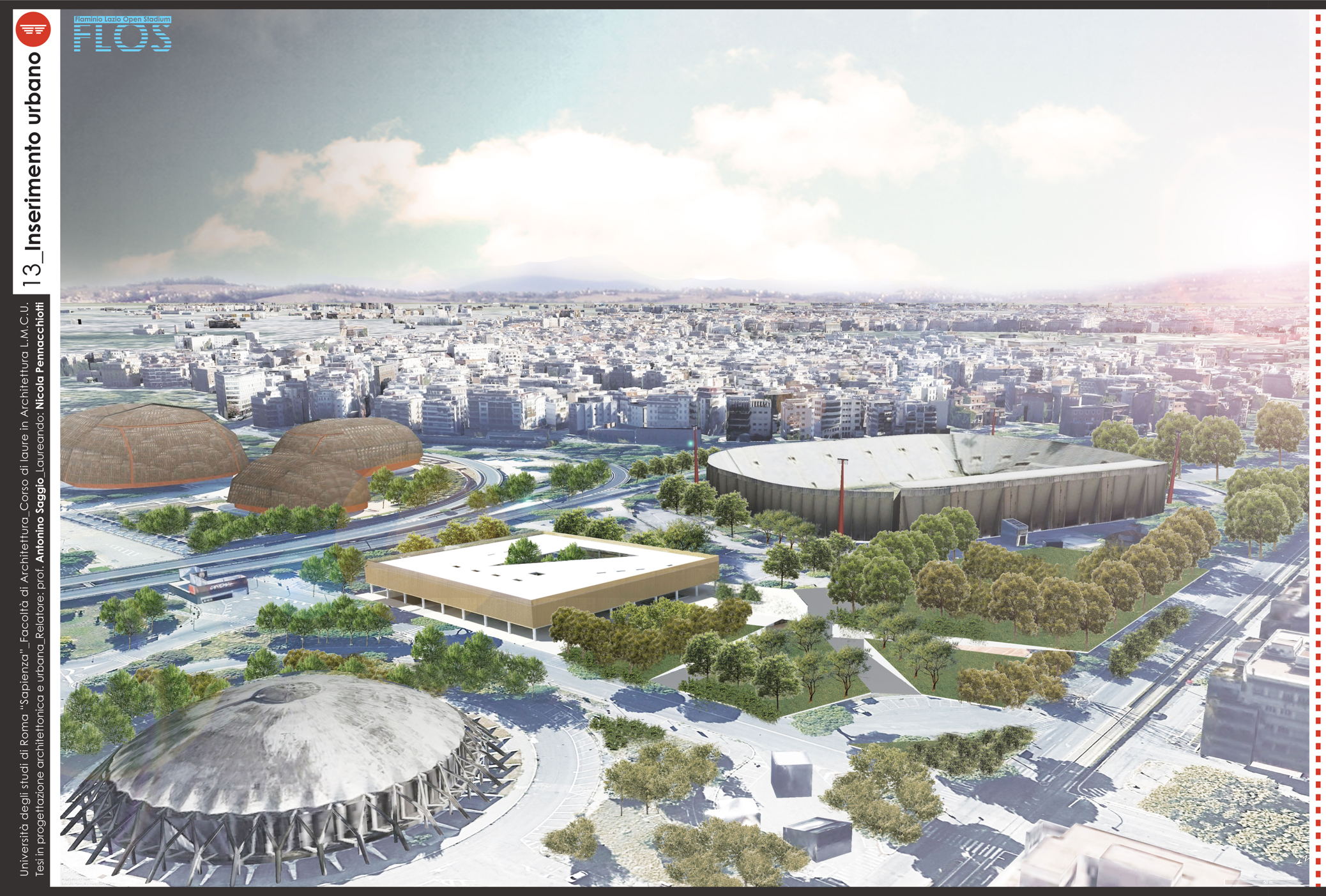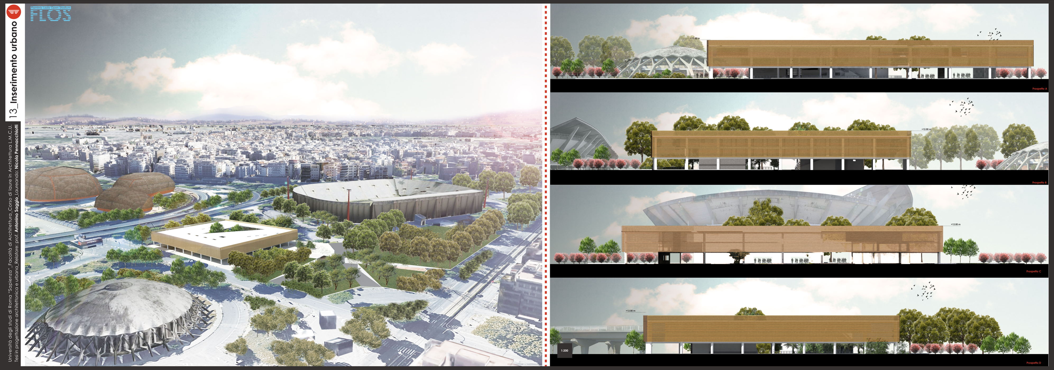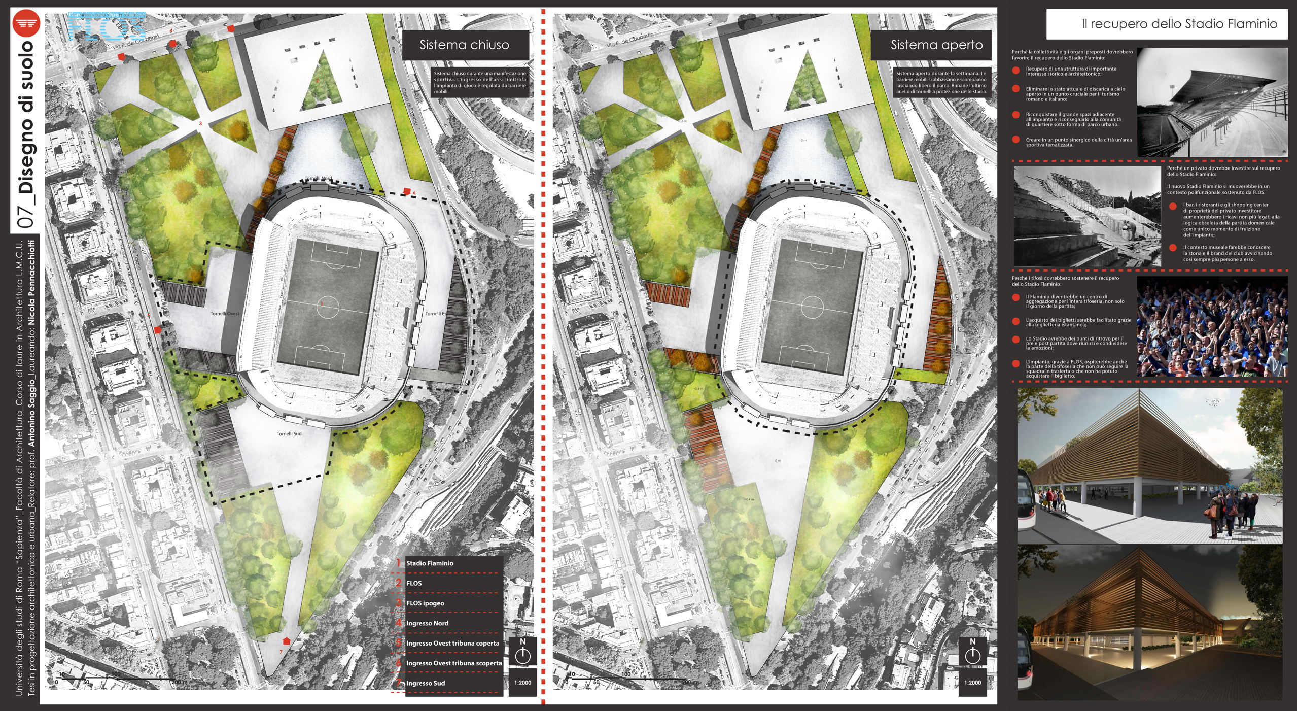 Il progetto Flos (Flaminio Lazio Open Stadium) nasce dalla necessità di recuperare lo Stadio Flaminio, ormai tristemente abbandonato da troppi anni, senza intervenire direttamente sull'impianto sportivo, ma adeguandolo agli standard di fruizione e sicurezza attraverso la progettazione di nuove strutture nelle aree immediatamente limitrofe. L'obiettivo è far rivivere l'importante progetto di Nervi con il suo adeguamento alle norme degli impianti sportivi italiani di nuova generazione, al fine di riaprire la struttura alla collettività. Uno dei principi fondamentali è rendere attiva la struttura in un ciclo continuo di funzione e uso che vada ben oltre le poche ore della partita. L'obiettivo è raggiunto attraverso l'utilizzo dell'area circostante, oggi occupata da parcheggi, con edifici complementari allo stadio. Si tratta dell'approccio necessario oggi in qualunque nuova concezione di stadio che da struttura mono tasking si trasforma appunto in una struttura plurifunzionale. Il progetto utilizza lo stadio per le partite della società sportiva Lazio (viste le numerose richieste da parte dei tifosi e di giornalisti vicini all'ambiente bianco-celeste) e i nuovi edifici come head quarter di un programma di mixitè che, oltre a implementare i ricavi della società con attività commerciali (ristoranti, bar, shop e hotel) sarà vitale per il quartiere attraverso la riconoscibilità del brand Lazio. Si viene così a contribuire alla riqualificazione di un nodo centrale dell'asse generato tra il ponte della musica e l'area sportiva del Foro italico e l'Auditorium.