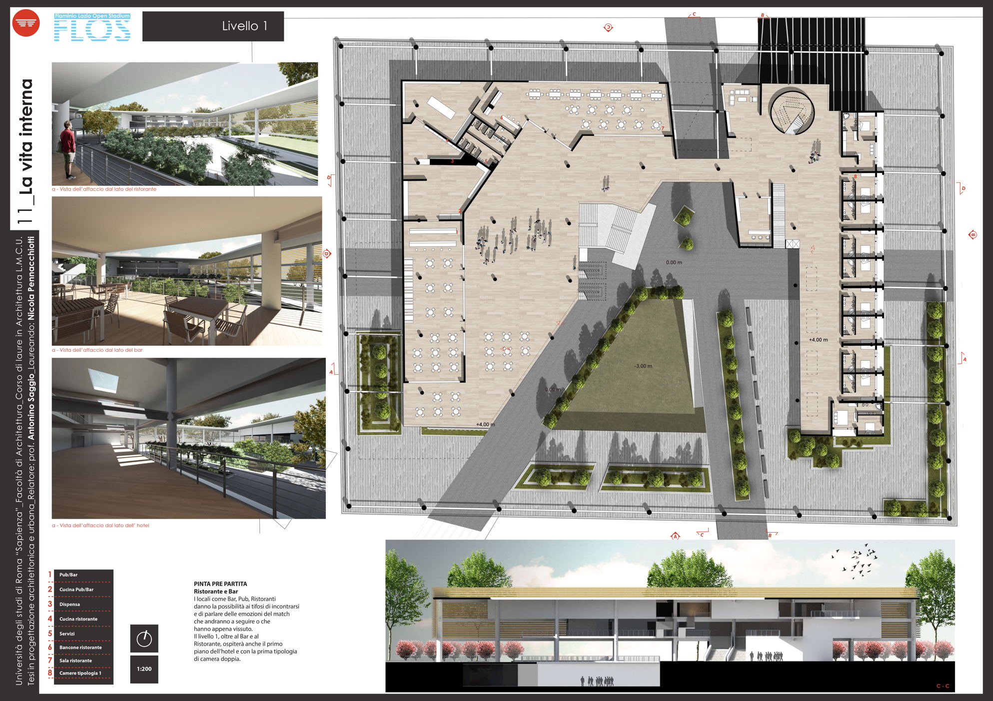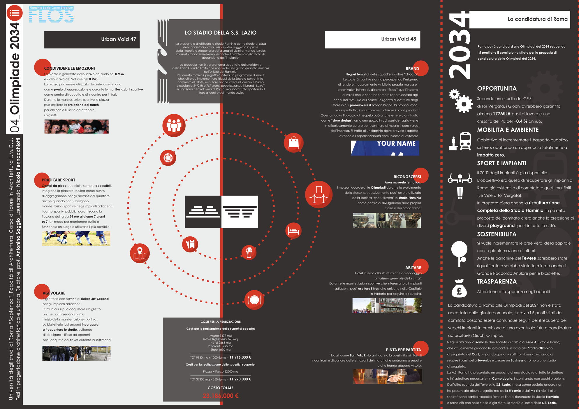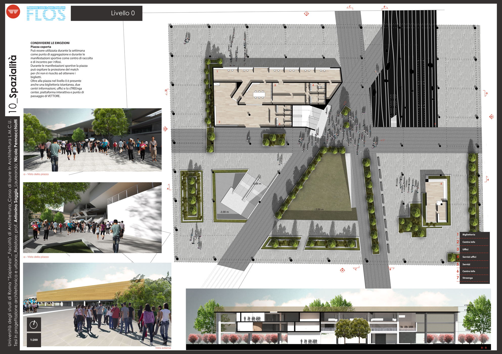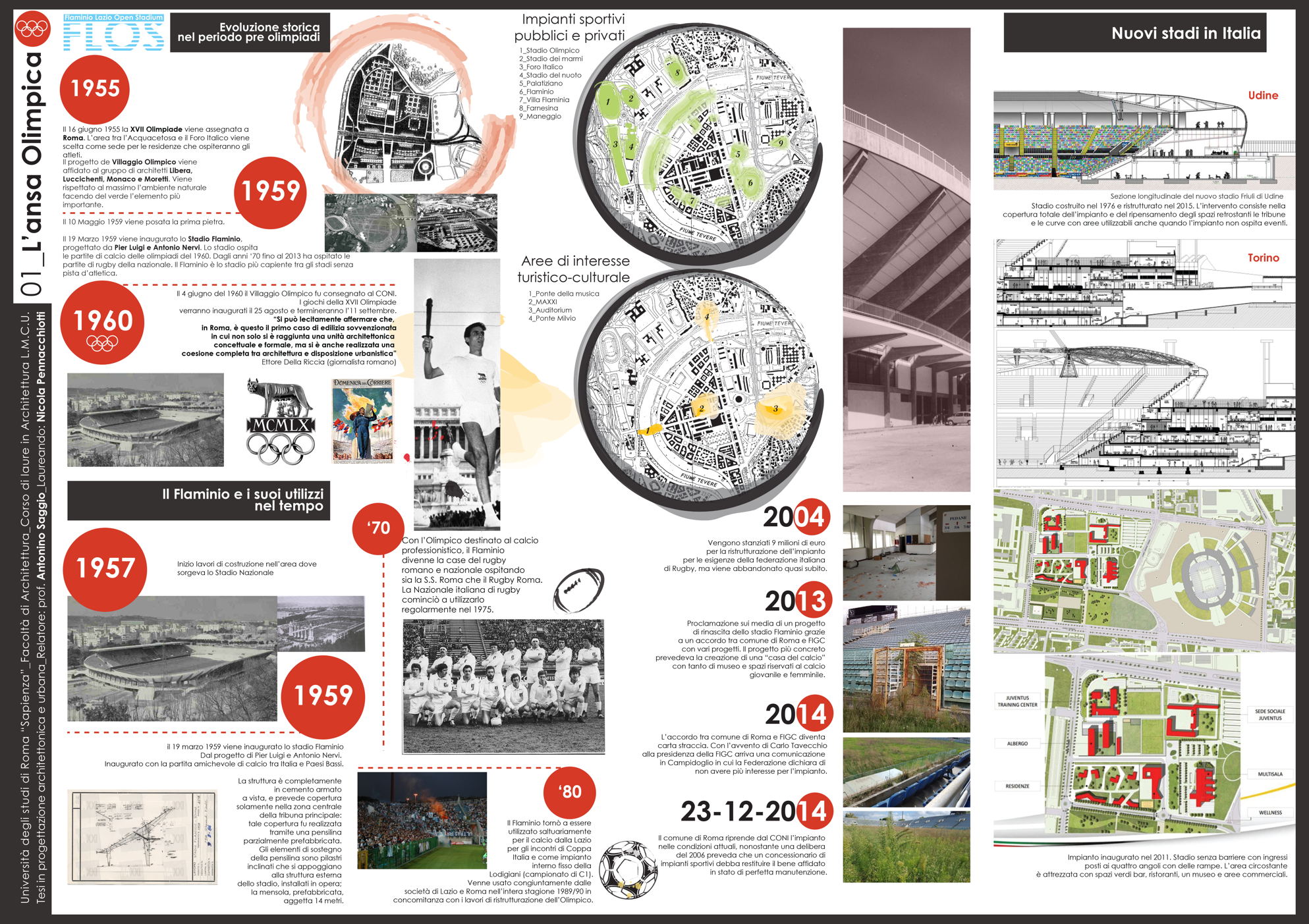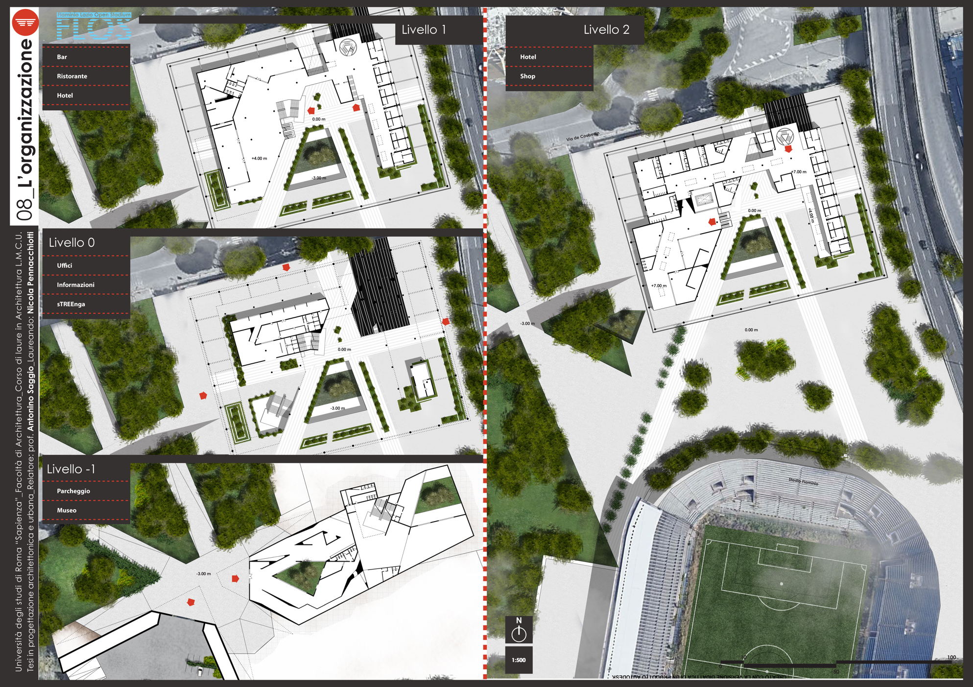 Il progetto Flos (Flaminio Lazio Open Stadium) nasce dalla necessità di recuperare lo Stadio Flaminio, ormai tristemente abbandonato da troppi anni, senza intervenire direttamente sull'impianto sportivo, ma adeguandolo agli standard di fruizione e sicurezza attraverso la progettazione di nuove strutture nelle aree immediatamente limitrofe. L'obiettivo è far rivivere l'importante progetto di Nervi con il suo adeguamento alle norme degli impianti sportivi italiani di nuova generazione, al fine di riaprire la struttura alla collettività. Uno dei principi fondamentali è rendere attiva la struttura in un ciclo continuo di funzione e uso che vada ben oltre le poche ore della partita. L'obiettivo è raggiunto attraverso l'utilizzo dell'area circostante, oggi occupata da parcheggi, con edifici complementari allo stadio. Si tratta dell'approccio necessario oggi in qualunque nuova concezione di stadio che da struttura mono tasking si trasforma appunto in una struttura plurifunzionale. Il progetto utilizza lo stadio per le partite della società sportiva Lazio (viste le numerose richieste da parte dei tifosi e di giornalisti vicini all'ambiente bianco-celeste) e i nuovi edifici come head quarter di un programma di mixitè che, oltre a implementare i ricavi della società con attività commerciali (ristoranti, bar, shop e hotel) sarà vitale per il quartiere attraverso la riconoscibilità del brand Lazio. Si viene così a contribuire alla riqualificazione di un nodo centrale dell'asse generato tra il ponte della musica e l'area sportiva del Foro italico e l'Auditorium.