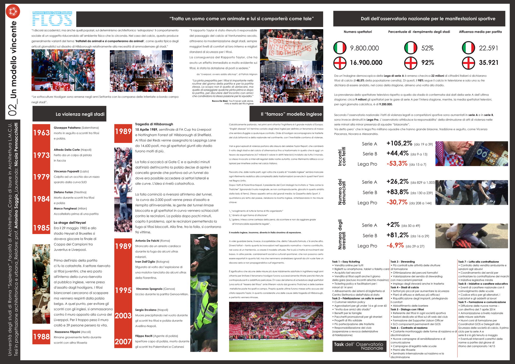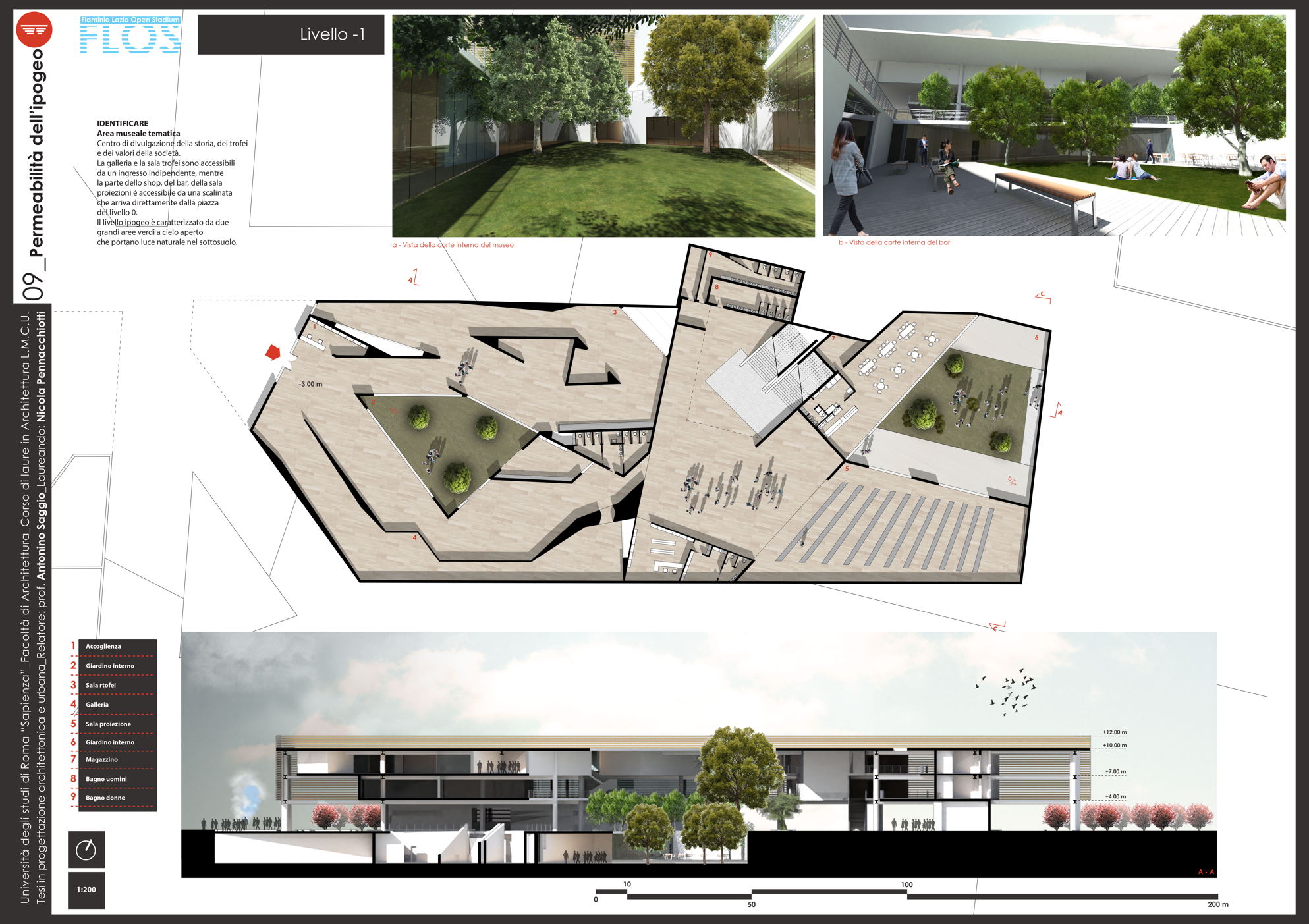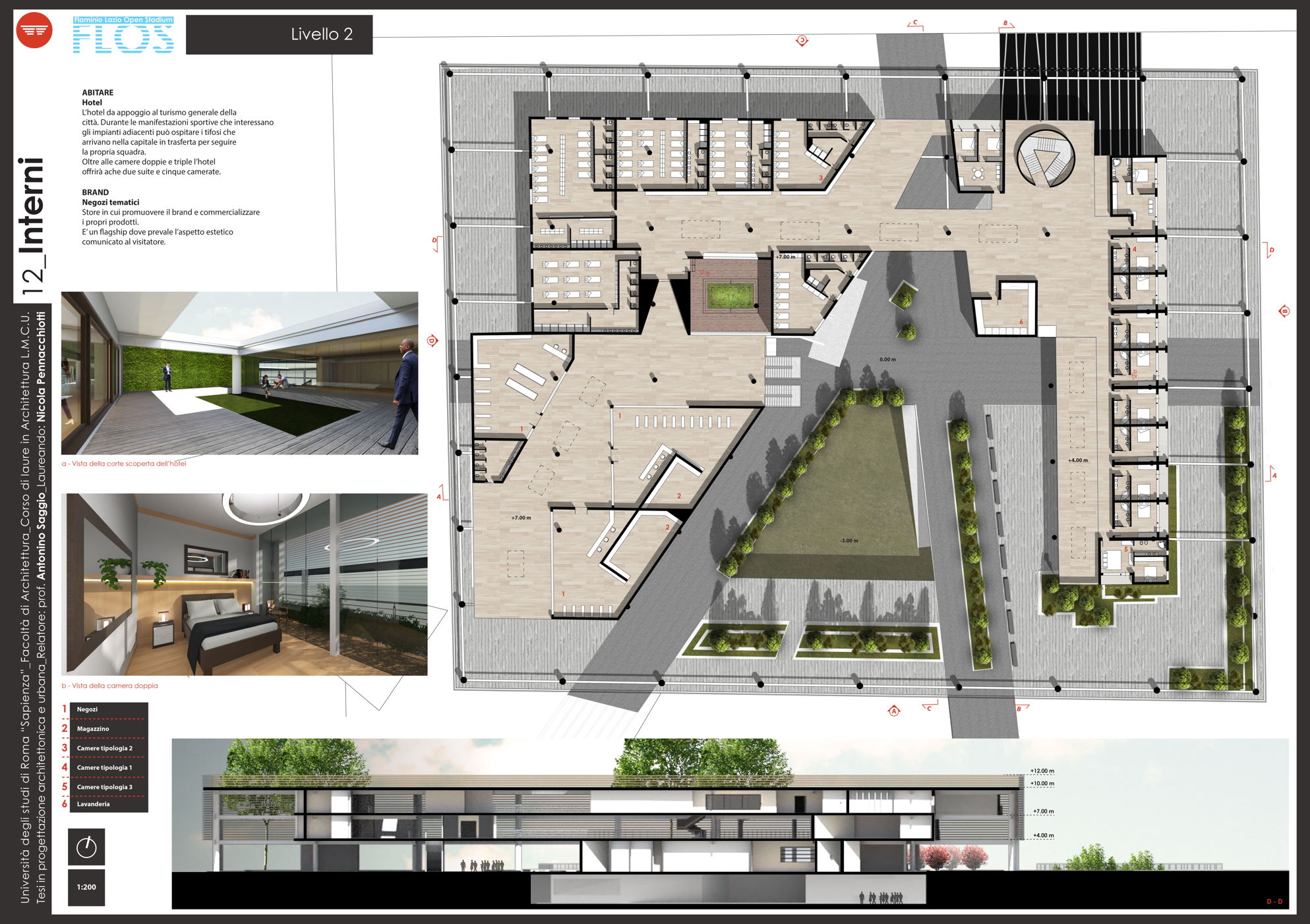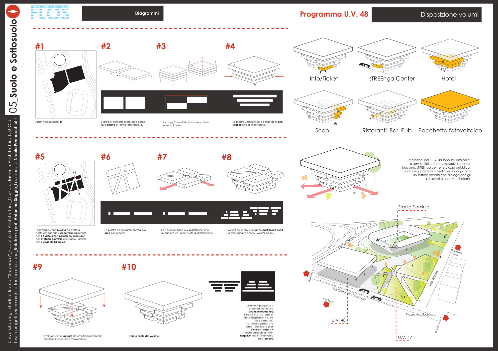 Il progetto Flos (Flaminio Lazio Open Stadium) nasce dalla necessità di recuperare lo Stadio Flaminio, ormai tristemente abbandonato da troppi anni, senza intervenire direttamente sull'impianto sportivo, ma adeguandolo agli standard di fruizione e sicurezza attraverso la progettazione di nuove strutture nelle aree immediatamente limitrofe. L'obiettivo è far rivivere l'importante progetto di Nervi con il suo adeguamento alle norme degli impianti sportivi italiani di nuova generazione, al fine di riaprire la struttura alla collettività. Uno dei principi fondamentali è rendere attiva la struttura in un ciclo continuo di funzione e uso che vada ben oltre le poche ore della partita. L'obiettivo è raggiunto attraverso l'utilizzo dell'area circostante, oggi occupata da parcheggi, con edifici complementari allo stadio. Si tratta dell'approccio necessario oggi in qualunque nuova concezione di stadio che da struttura mono tasking si trasforma appunto in una struttura plurifunzionale. Il progetto utilizza lo stadio per le partite della società sportiva Lazio (viste le numerose richieste da parte dei tifosi e di giornalisti vicini all'ambiente bianco-celeste) e i nuovi edifici come head quarter di un programma di mixitè che, oltre a implementare i ricavi della società con attività commerciali (ristoranti, bar, shop e hotel) sarà vitale per il quartiere attraverso la riconoscibilità del brand Lazio. Si viene così a contribuire alla riqualificazione di un nodo centrale dell'asse generato tra il ponte della musica e l'area sportiva del Foro italico e l'Auditorium.