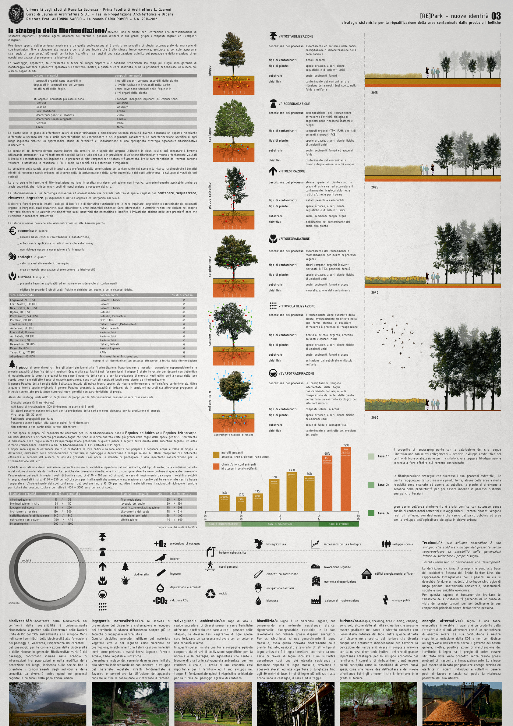 Il progetto [R.E.]Park/Nuove Identità - dopo ampi studi anche con la consulenza di esperti universitari di agraria e del CNR imposta una strategia di una sostituzione/riforestazione di carattere fitorimediale. Dopo una bonifica del materiale militare ancora esistente nell’area e nei suoi starti superficiali, e la rimozione della stesse essenze vegetali sponatnee, si procederà con una nuova piantumazione con essenze arboree capaci di “estrarre” i veleni dagli strati più profondi e innestare un processo di disinquinamento e di bonifica. Con un sistema natruale si migliorerà la situazione della falda e di conseguenza delle acque del lago.