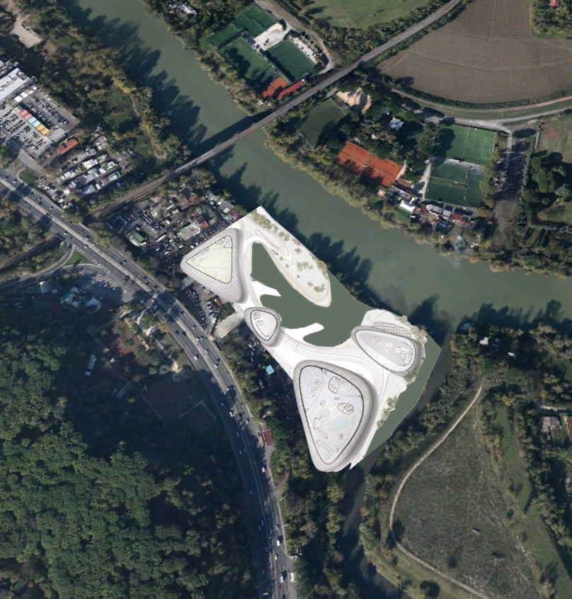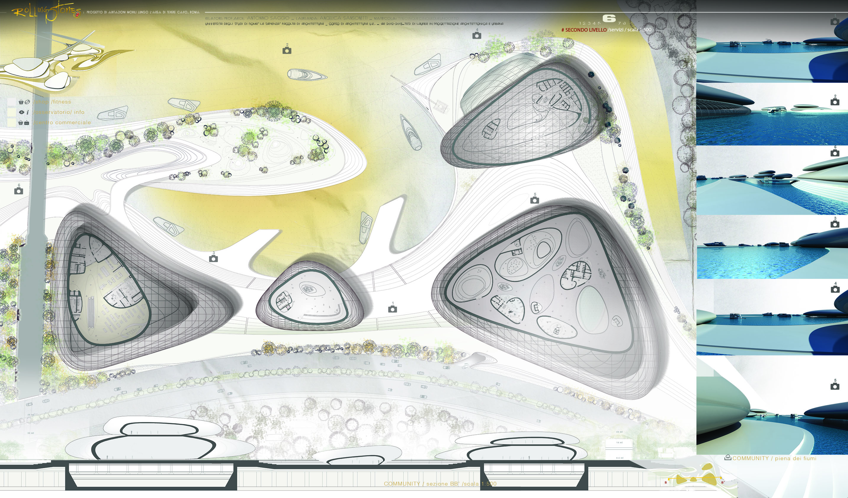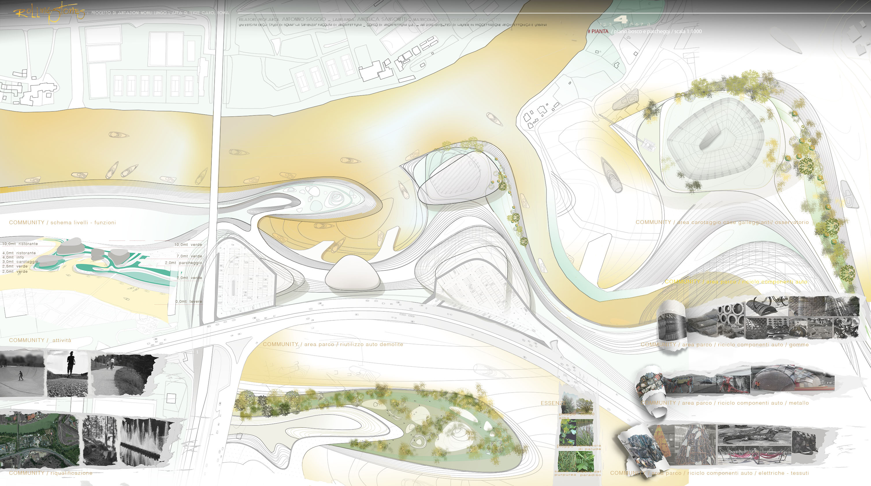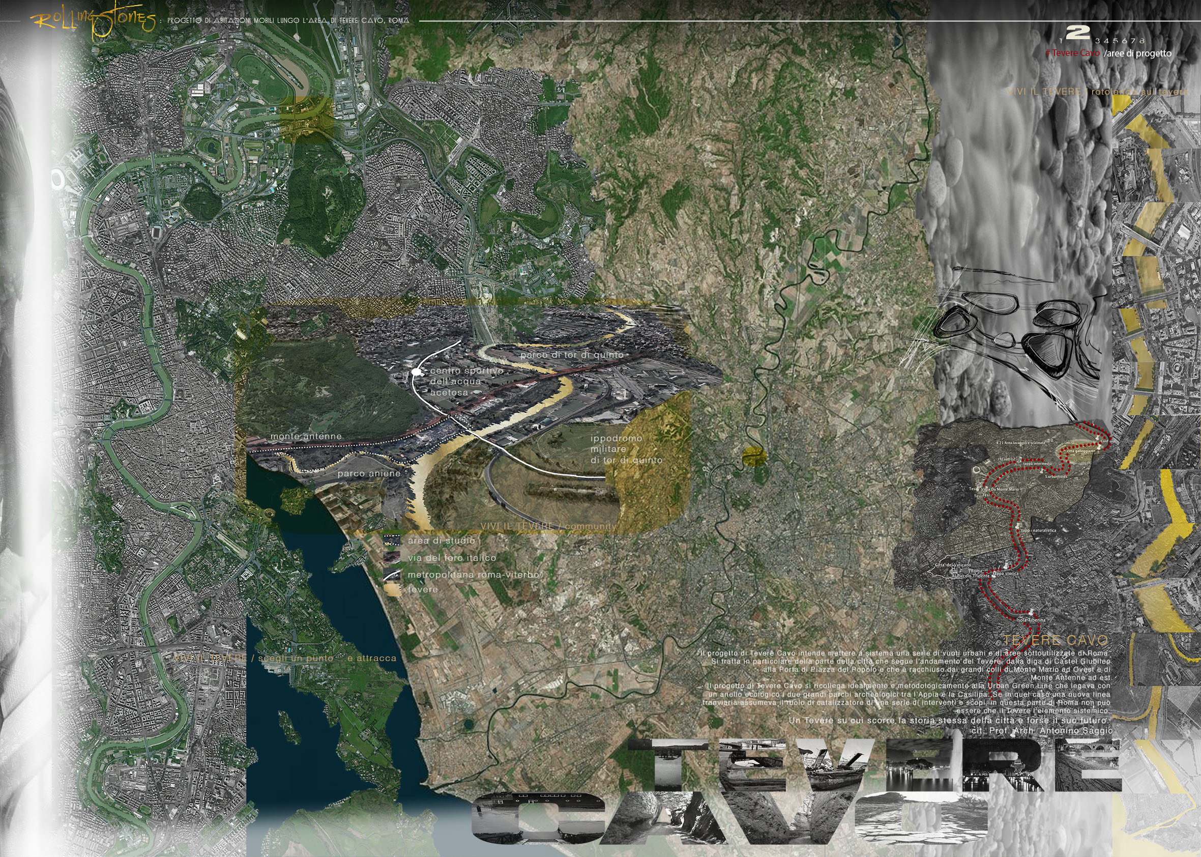 Un'area sicuramente di grande valore lungo il corso metropolitano del fiume Tevere è quella della foce dell'Aniene. Un luogo significativo paesaggisticamente e ovviamente simbolicamente. Oggi questa area è sostanzialmente nascosta alla città, non fruita e non celebrata in alcun modo e anzi molto degradata. Infatti sulla sponde ovest essa è ampiamente occultyata da uno sfasciacarrozze. che si innesta subito sotto la quota della Via olimpica che corre qui parallela al tevere. Il progetta affronta questa crisi innestandovi una idee forza/ quella delle case galleggianti una tipo di abitazione molto presente in molte città d'europa e del mondo. La foce dell'Aniene viene rimodellata con un disegno di suolo che crea collina artificiale lungo il Tevere. Questa collina è creata dal compattamento delle ferraglie delel macchine proveninete dal preesistente sfasciacarrozze. Sopra le ferraglie ricompattate, il terreno è ritombato e riplantumato Questa prima isola artificiale detemina la possibilità di avere una protezione ad una insenatura interna con due moli e con altri corpi che circondano la baia. I corpi sono pensati come grandi sassi, arenati sull'acqua o sulla riva. Sono adibiti a funzioni di rimessaggio ai piani più bassi, menre ai piani superiori ospitano strutture commerciali e un ristorante. La piccola baia interna è pensata a proteggere nel periodo invernale le case galleggianti. Nella stagione esitiva le case galleggianti sono spostate in altre parti del tevere e possono offrireuna residenza di alta qualità per una clientela selezionata che intende passare alcune settimane nei pressi dei siti più belli di Roma vicino a Castel Sant'angelo, all'isola Tiberina, a Ponte Sisto.