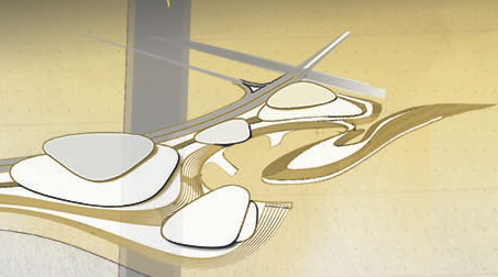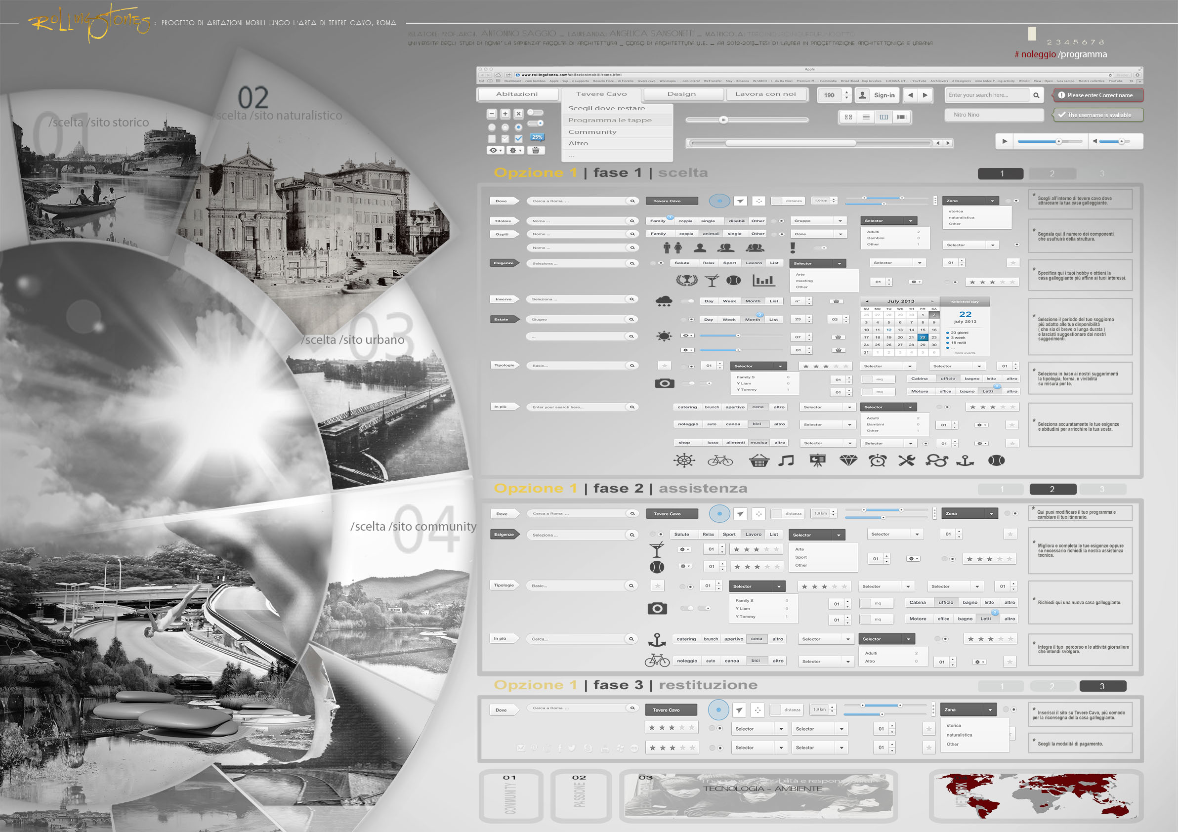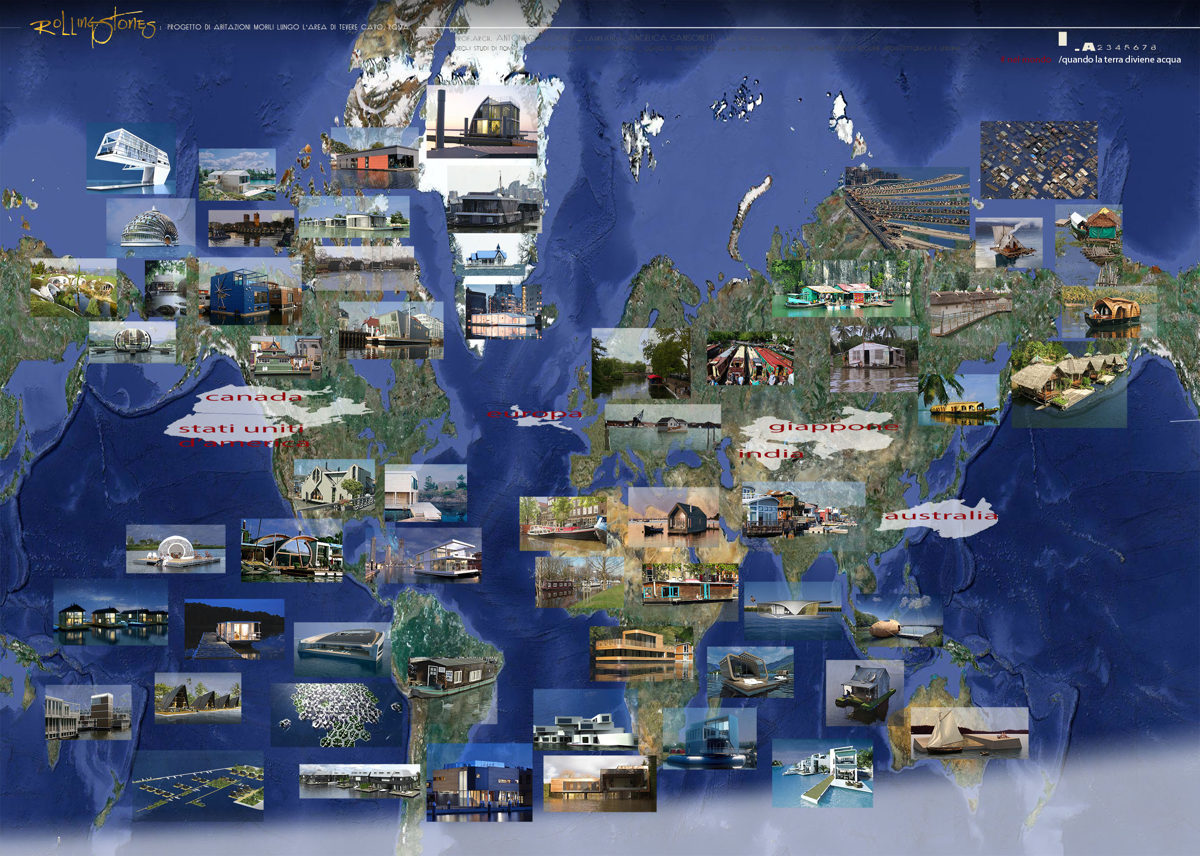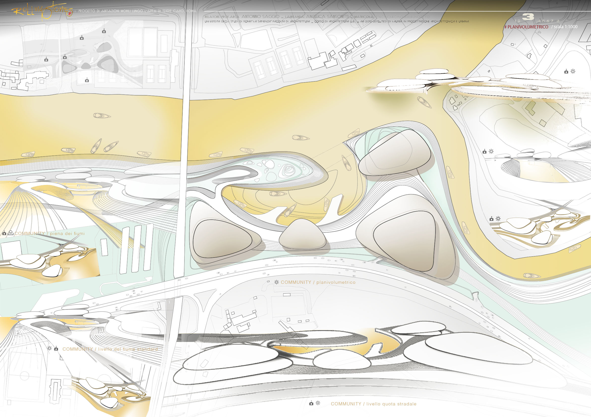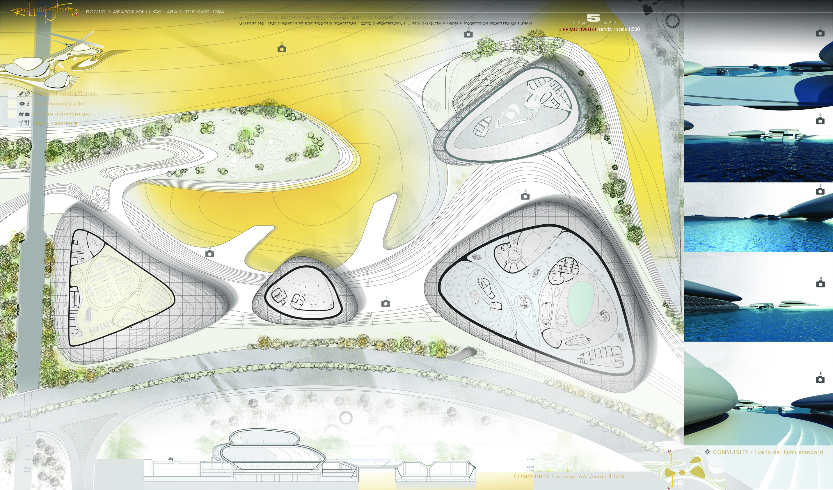 Un'area sicuramente di grande valore lungo il corso metropolitano del fiume Tevere è quella della foce dell'Aniene. Un luogo significativo paesaggisticamente e ovviamente simbolicamente. Oggi questa area è sostanzialmente nascosta alla città, non fruita e non celebrata in alcun modo e anzi molto degradata. Infatti sulla sponde ovest essa è ampiamente occultyata da uno sfasciacarrozze. che si innesta subito sotto la quota della Via olimpica che corre qui parallela al tevere. Il progetta affronta questa crisi innestandovi una idee forza/ quella delle case galleggianti una tipo di abitazione molto presente in molte città d'europa e del mondo. La foce dell'Aniene viene rimodellata con un disegno di suolo che crea collina artificiale lungo il Tevere. Questa collina è creata dal compattamento delle ferraglie delel macchine proveninete dal preesistente sfasciacarrozze. Sopra le ferraglie ricompattate, il terreno è ritombato e riplantumato Questa prima isola artificiale detemina la possibilità di avere una protezione ad una insenatura interna con due moli e con altri corpi che circondano la baia. I corpi sono pensati come grandi sassi, arenati sull'acqua o sulla riva. Sono adibiti a funzioni di rimessaggio ai piani più bassi, menre ai piani superiori ospitano strutture commerciali e un ristorante. La piccola baia interna è pensata a proteggere nel periodo invernale le case galleggianti. Nella stagione esitiva le case galleggianti sono spostate in altre parti del tevere e possono offrireuna residenza di alta qualità per una clientela selezionata che intende passare alcune settimane nei pressi dei siti più belli di Roma vicino a Castel Sant'angelo, all'isola Tiberina, a Ponte Sisto.
