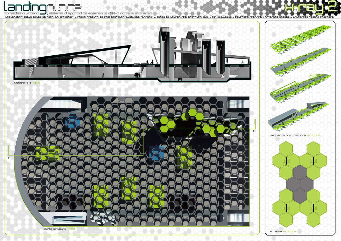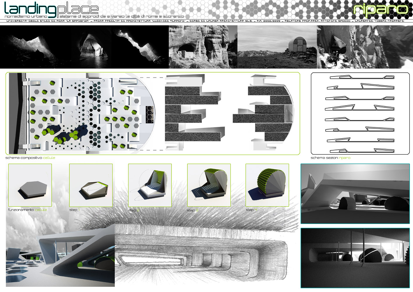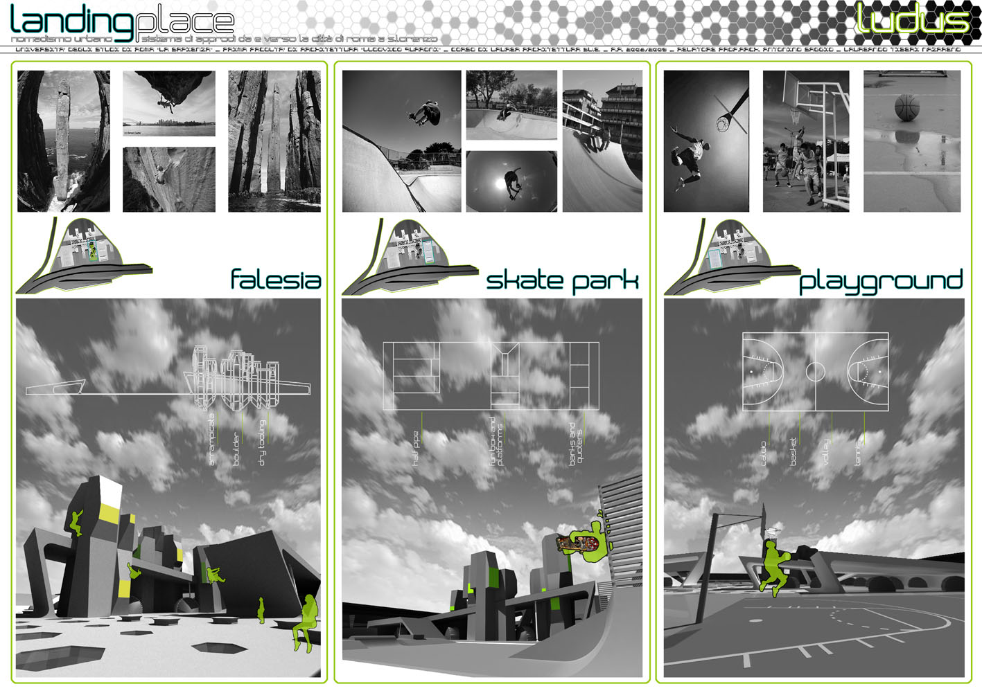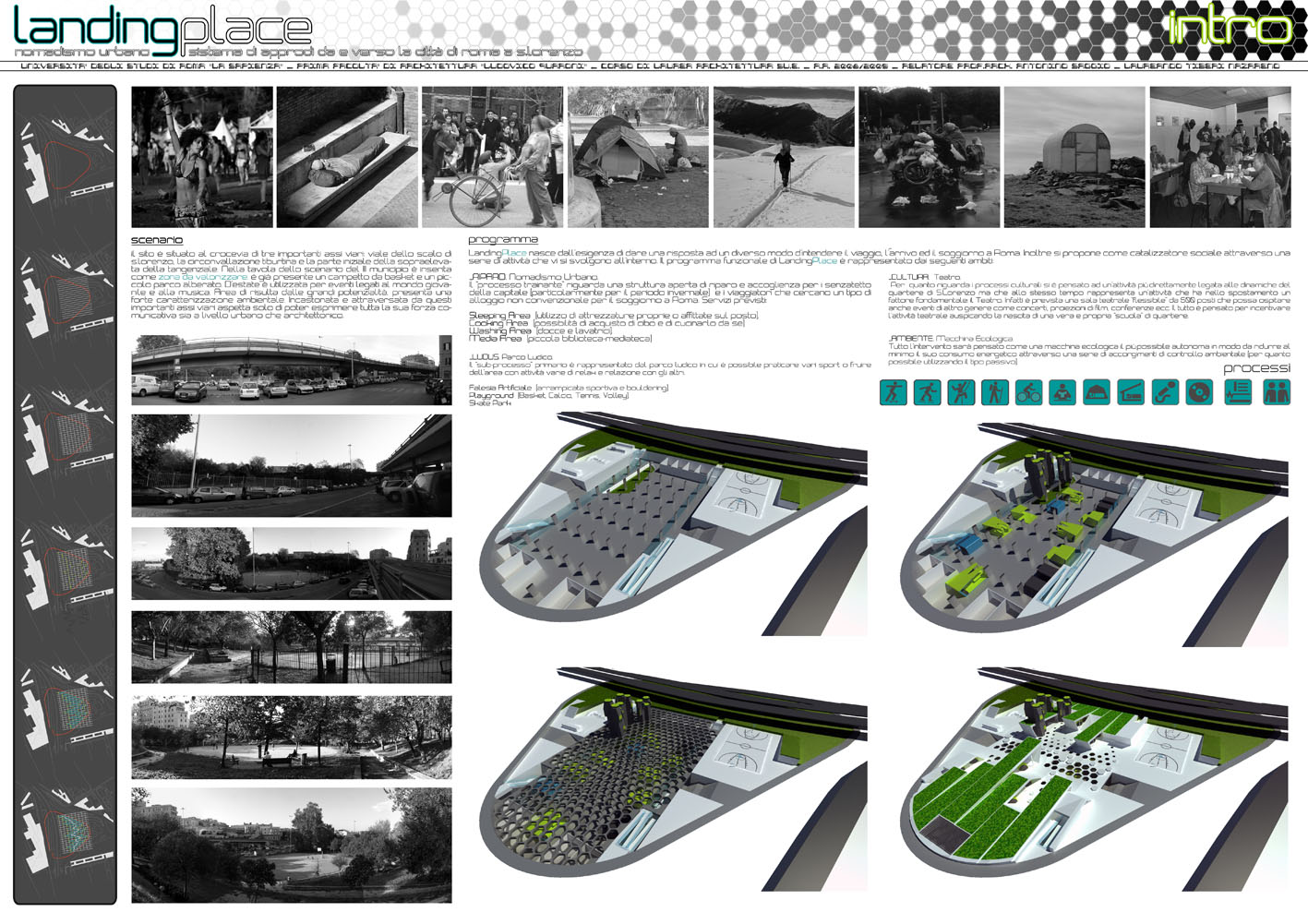 In una area marginale del quartiere san Lorenzo, nei pressi dello svincolo della sopraelevata in uscita Campo Verano, nasce Landing place. Il progetto propone un programma innovativo centrato sul turismo giovanile. Il progetta inventa un paesaggio lunare, a metà naturale a metà artificiale dove su strutture appositamente create i giovani possano trovare riparo in una condizione tra il campeggio e l'ostello. Il progetto allo stesso tempo offre al quartiere una area attrezzata per lo sport urbano e nel sottosuolo una serie di attività collettive basate sul teatro legate intimamente al viaggio. Le forme e le strutture che organizzano il progetto presentano anche innovative caratteristiche ambientali: i dolmen per le arrampicate oltre che punti focali del progetto sono per esempio anche sistema di ventilazione naturale, il sistema dei ripari contengono strutture di deapurazione o per la raccolta dell'illuminazione naturale. Dal punto di vista della formatività il progetto è originale nel combinare una modalità progettuale basata sulla land form e sul suolo come struttura che organizza gli eventi architettonici e una decisa presenza figurale e iconica che ne segnala la presenza con forza nell'intorno urbano e nella memoria dei fruitori.