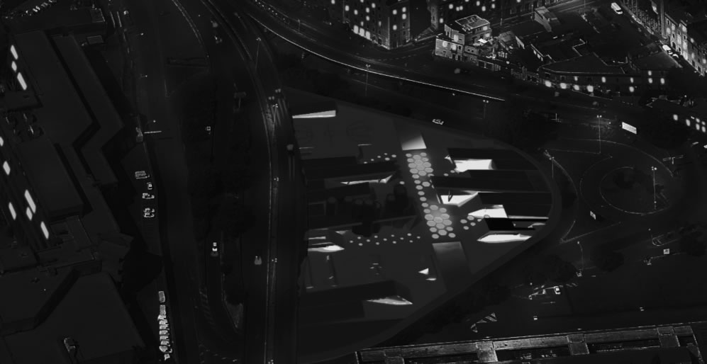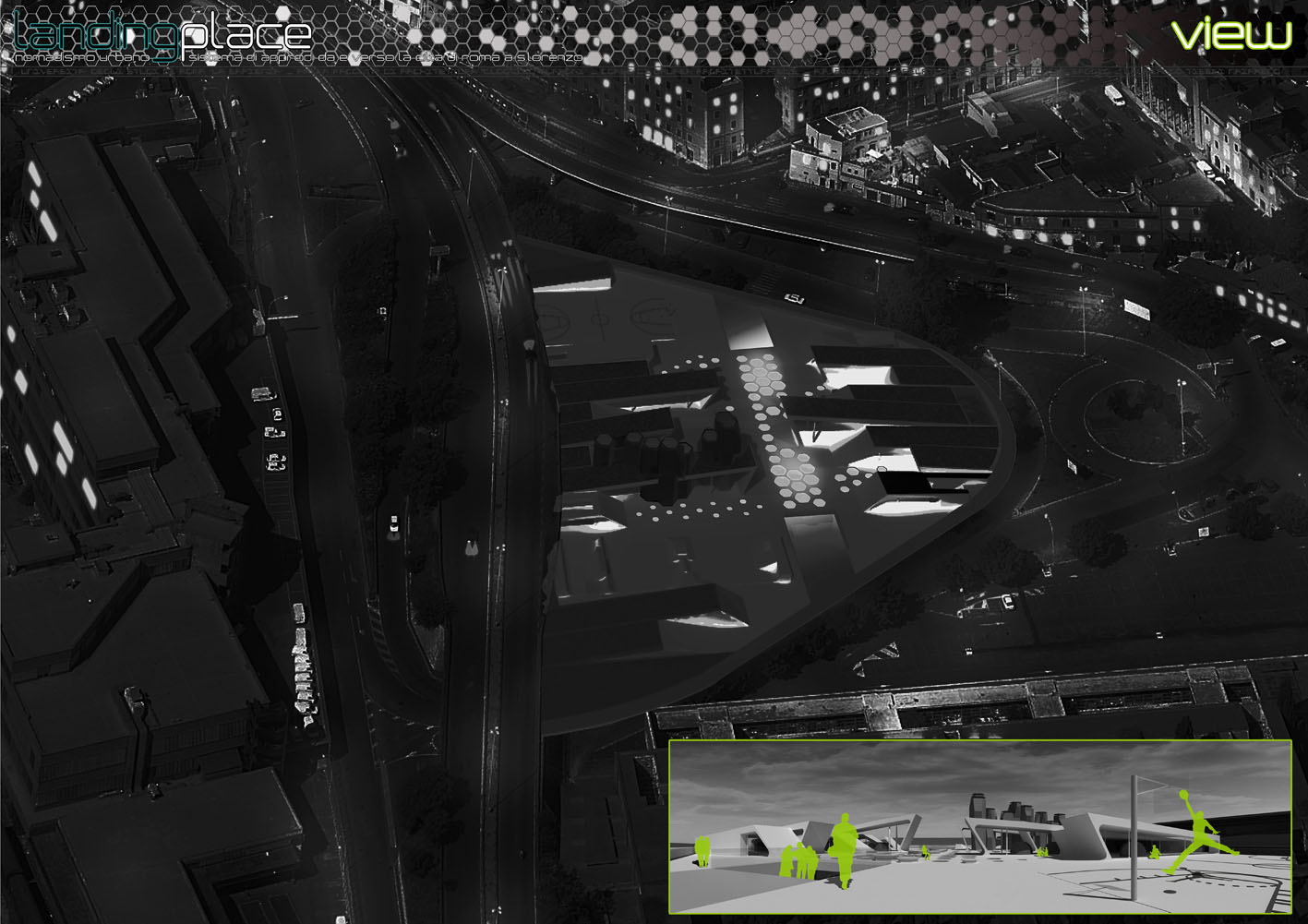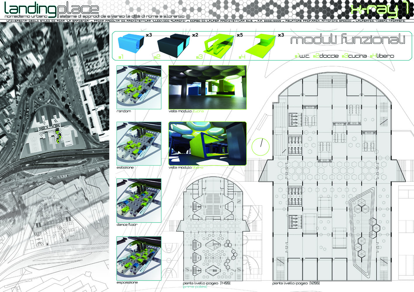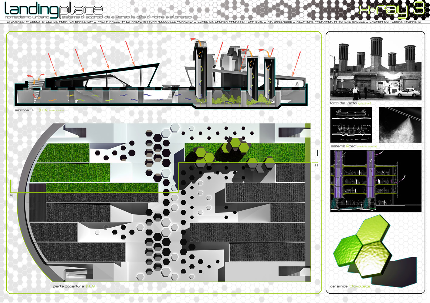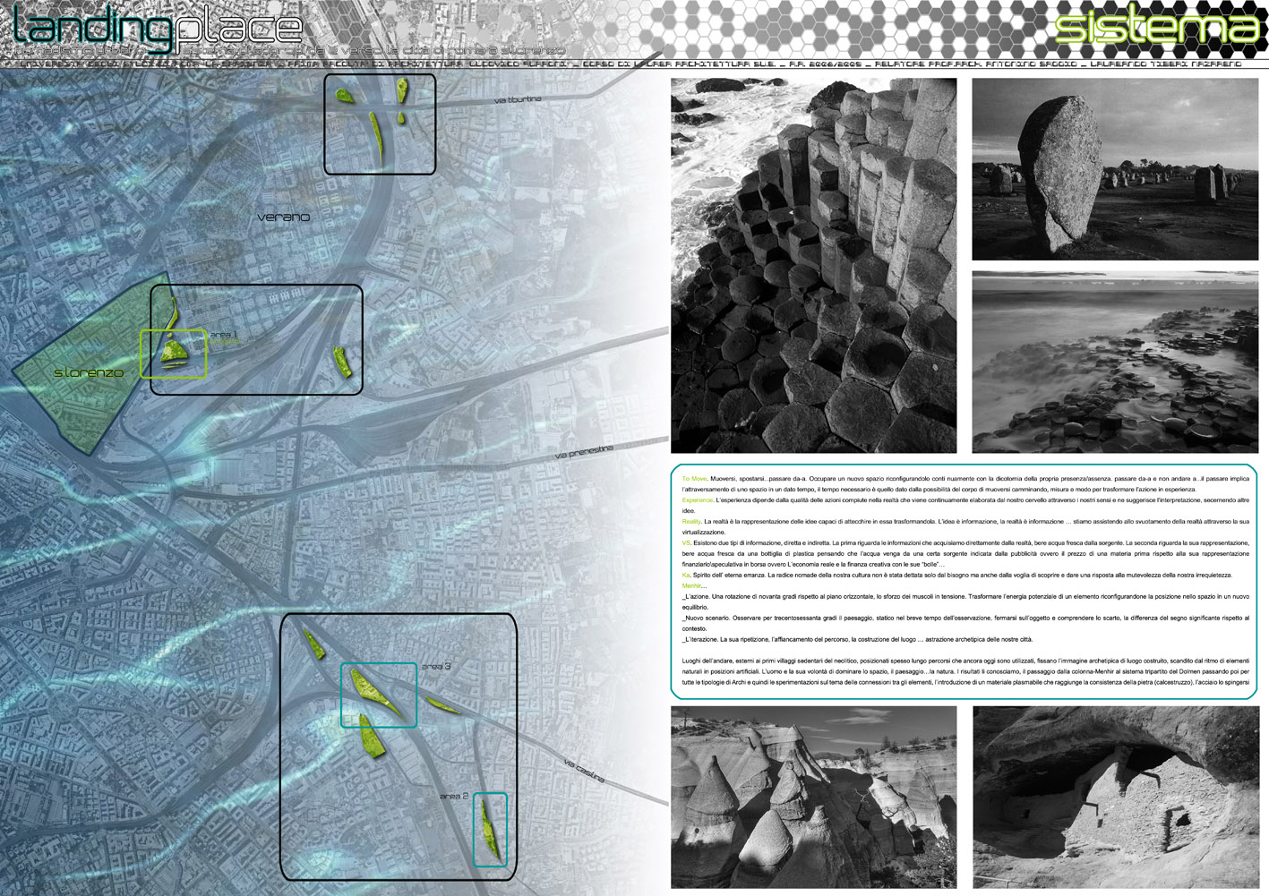 In una area marginale del quartiere san Lorenzo, nei pressi dello svincolo della sopraelevata in uscita Campo Verano, nasce Landing place. Il progetto propone un programma innovativo centrato sul turismo giovanile. Il progetta inventa un paesaggio lunare, a metà naturale a metà artificiale dove su strutture appositamente create i giovani possano trovare riparo in una condizione tra il campeggio e l'ostello. Il progetto allo stesso tempo offre al quartiere una area attrezzata per lo sport urbano e nel sottosuolo una serie di attività collettive basate sul teatro legate intimamente al viaggio. Le forme e le strutture che organizzano il progetto presentano anche innovative caratteristiche ambientali: i dolmen per le arrampicate oltre che punti focali del progetto sono per esempio anche sistema di ventilazione naturale, il sistema dei ripari contengono strutture di deapurazione o per la raccolta dell'illuminazione naturale. Dal punto di vista della formatività il progetto è originale nel combinare una modalità progettuale basata sulla land form e sul suolo come struttura che organizza gli eventi architettonici e una decisa presenza figurale e iconica che ne segnala la presenza con forza nell'intorno urbano e nella memoria dei fruitori.