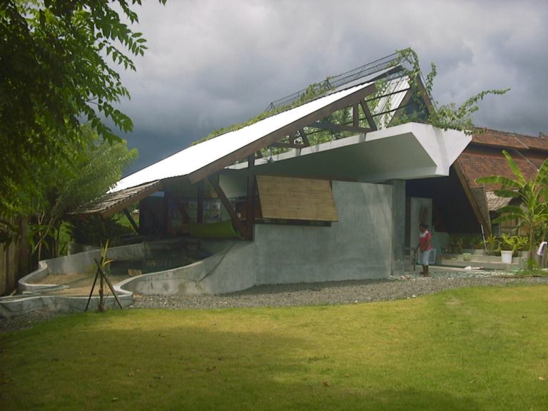 Organizza il progetto su una invenzione. Si tratta di un'idea semplice e forte ad un tempo: una trave che, posta su un muro attrezzato lungo la metà dell'edificio, innerva l'intera composizione. In pianta il muro attrezzato che sorregge la trave divide i due ambienti in cui si articola la piccola scuola: su un fronte gli ambienti si appropriano dello spazio esterno con una serie di vasche per il gioco che allo stesso tempo delimitano il progetto, mentre dalla parte opposta corre un canale di raccolta e refrigerio che conduce ad una piccola vasca d'acqua. In sezione la trave sorregge da ambo i lati il tetto. Da un lato la falda è dolcemente inclinata con delle asole vetrate in sommità mentre dalla parte opposta il tetto ha la brusca impennata di una copertura che si articola in due falde ad angolo acuto. La trave in cemento armato ha una sezione a "V" non solo per sorreggere i travetti in legno delle coperture ma anche per accogliere e sollevare un torrente di terra. La forma a "V" è funzionalmente un vaso che permette alla vegetazione di crescere rigogliosa e di coprire le poverissime lamiere grecate delle coperture, evitando il surriscaldamento e fornendo una prova di intelligenza progettuale. Un cuore verde anima così questa architettura e dà una nuova prova del talento inventivo e sensibile di D'Ambrosio. Un nemo propheta in patria che sta disseminando la lontana Bali di opere bellissime.