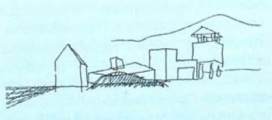 Pezzi isolati e riconoscibili (la torretta della camera, il padiglione-ospiti con appeso lo schermo, la serra del soggiorno) danno forma, come in un villaggio, agli spazi all'aperto.