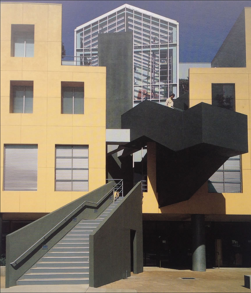 Chiamato a redigere il piano di sviluppo del piccolo campus, Gehry disarticola il programma in edifici distinti. È una convincente strategia pratica, ma soprattutto il motore della soluzione architettonica. Non conta tanto la singolarità dell'edificio quanto lo spazio pubblico che esso crea e la socialità che promuove La strada interna viene deformata in piazzette oblique con una logica di creazione "sommatoria", analitica. Nel disegno degli edifici si attua una tecnica di "transfigurazione" che, partendo da icone note (il tempio, la galleria, la chiesa), le pone in crisi nei materiali, nei colori, nei contrasti volumetrici.