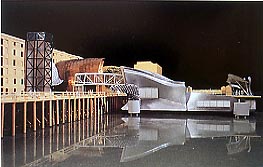 Un lungo ex magazzino che ospita il museo funziona da fondale per un addizione scultorea che si articola come un percorso che, attraverso una serie di giocosi eventi, arriva prima alla banchina e poi a una piattaforma galleggiante sul canale.