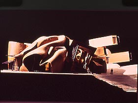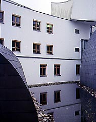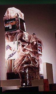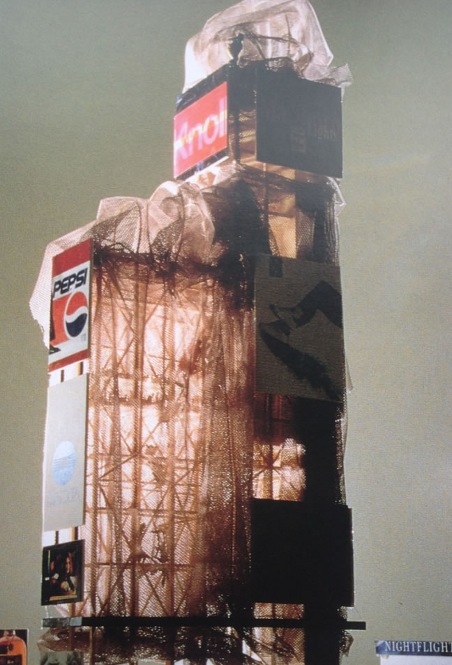 Nell'ultimo progetto, capisce che è proprio la rete, il tutto. Avvolge in un meandrico e trasparente drappeggio tutta la costruzione. La rete entra e esce, si avvolge su stessa e avvolge le informazioni, gli schermi, le icone, le proiezioni, i pupazzi pubblicitari.