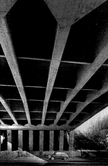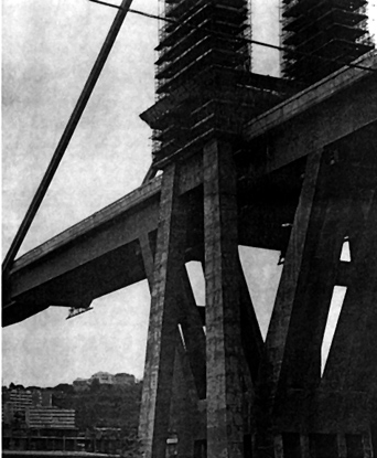 Il primo, più piccolo, è incernierato sulla base di appoggio e sorregge a mensola la prima parte della travatura, mentre il secondo - più grande - si impenna nello spazio ad ancorare gli stralli cui è appeso il secondo tratto della travatura. Le forme scultoree e l’equilibrio magico di forze interagenti coaugulate in questo schema statico rappresenta il marchio e il logo di Morandi e gli permette di portare a compimento incarichi prestigiosi per tutta l’arte italiana del costruire: il ponte di nove chilometri sulla laguna di Maracaibo in Venezuela all’inizio degli anni Sessanta, il viadotto sul Polcevera a Genova del 1964, il Ponte sul Wadi El Kuff in Libia completato nel 1971. Sono impetuosi interventi dell’uomo sulle grandi dimensioni della natura o della città di cui molto si tratta e si discute sul catalogo. Ma con lo stesso equilibrio di forze dà vita anche a piccoli episodi altrettanto calibrati e belli come il Viadotto sull’ansa del Tevere del 1965.