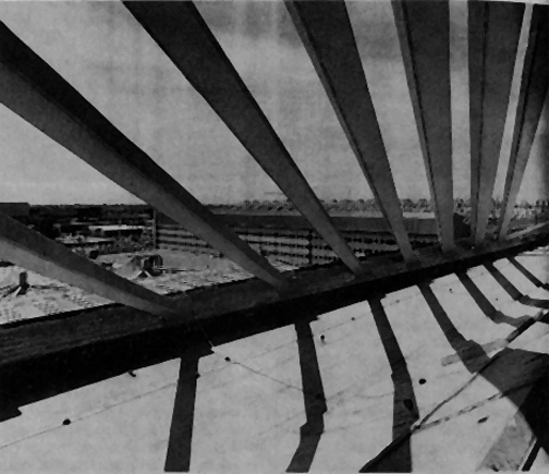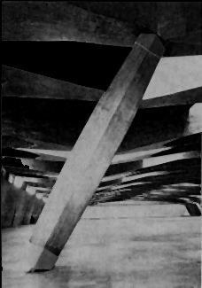 potenti travature a sezione variabile che si raccolgono nei supporti inclinati