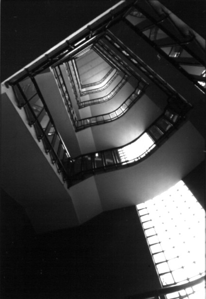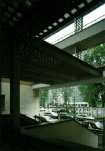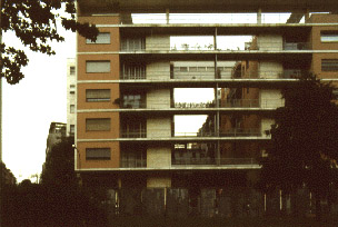 A Como l'invaso centrale collegava le adunate interne a quelle esterne come due piazze contigue, a Milano l'area tra i due blocchi - atrio al primo livello e vuoto schermato dai balconi-passerelle a quelli successivi - risolve la distribuzione tra i due corpi attraendo i flussi e la stessa atmosfera cittadina. Catturato nella costruzione, lo spazio a cielo aperto naturalmente detta lo sviluppo della forma architettonica che si serve dell'ossatura a telaio che, come un grande bow-window , si appende al di sopra del seminterrato e del primo piano. Nel prospetto su corso Sempione il telaio assolve due compiti: da una parte, unire le due ali edificate a quella vuota, dall'altra evidenziare, pur schermandole, le diverse profondità dell'edificio. L'effetto di stratificazione spaziale è magistralmente riuscito e segna il fascino di un'opera che rimane unica, anche se lo schema che la sottende ha la perentorietà di un tipo.