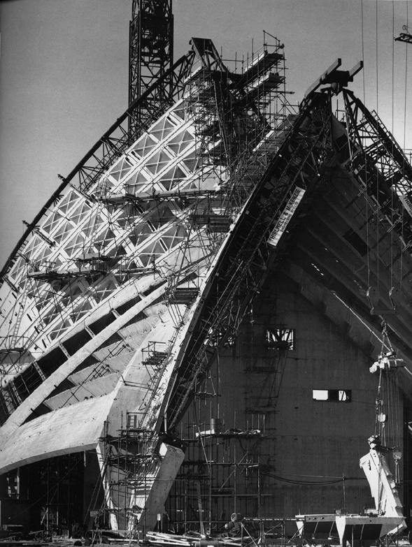 Utzon elabora le sue soluzioni scegliendo un imprenditore con cui ricercare insieme la soluzione migliore: progettazione strutturale e costruzione sono un fatto coesivo ed è quindi impossibile mettere in gara d’appalto la costruzione. Le proteste degli industriali in nome della libera concorrenza, insieme al cambiamento del quadro politico, sono tra le cause principali del suo allontanamento dal cantiere. L’idea di realizzare industrialmente non la ripetizione seriale di Mies ma i propri sogni entra in crisi nella realtà politica ed economica degli anni Sessanta ma trenta anni dopo, Gehry realizza con successo il Museo Guggenheim di Bilbao. Mentre Utzon doveva cercare una razionalità geometrica delle forme per poterle disegnare prima e realizzare industrialmente poi, grazie all’avvento del computer qualunque forma può essere rappresentata e le diverse imprese in gara proporranno ciascuna il proprio sistema per realizzarla. Vicini al duemila non solo l’immagine risulta svincolata dalla funzione, ma anche la costruzione è diventata autonoma.