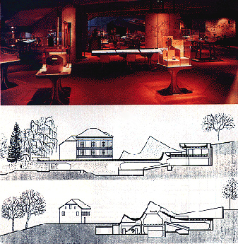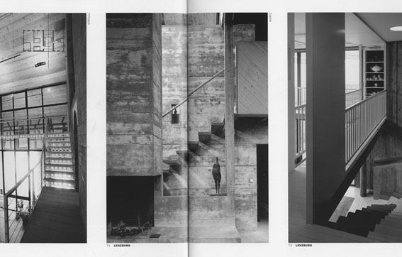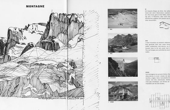 Qui lo schizzo di una montagna occupa tre quarti della pagina aperta e accanto si presentano foto di case costruite secondo l’accrecersi piramidale delle Alpi. Nella pagina "percorsi" c’è l’interno di una stazione del metrò, in quella "albero" delle tettoie per l’autobus, in quella "tetto" delle tenso strutture, o delle case guscio. A foto e disegni si accoppiano brevi testi (in inglese, francese e tedesco) con cenni estetici, o tecnici o filosofici o autobiografici o operativi (per esempio: "il carattere di un tetto si legge al suo bordo").