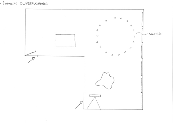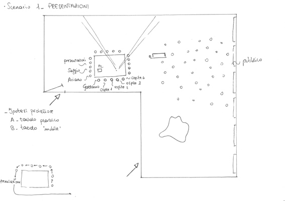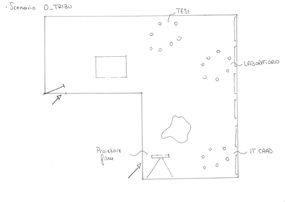 Il secondo che chiamiamo "Tribu" (v. 2) prevede il ragguppamento nei punti indicati del gruppo di ITCaad del Gruppo del Laboratorio IV e del Gruppo Tesi. Il pubblico girerà da uno all'altra e voi spiegherete i progetti agli interessati. Radio Spaienza sarà presente con film e radio per interviste. Il terzo Momento è Presentazioni (v. 3). Il tavolo del plastico è lo strumento delle presentazioni. Mentre il pubblico rimarra nella zona indicata il tavolo cosi organizzato. Un lato per gli invitati, un lato con SAggio e De Francesco e tre posti liberi per gli studenti che presenteranno per i 3 o 4 minuti richiesti. Gli altri due lati saranno anch'essi occupato da studenti che gireranno prendendo il posto accanto a me per chi presenta. Mano a mano alcuni entrano ed alcuni escono con una sorta di rotazione.. Grazie a Mara per aver rifatto i miei schizzi.