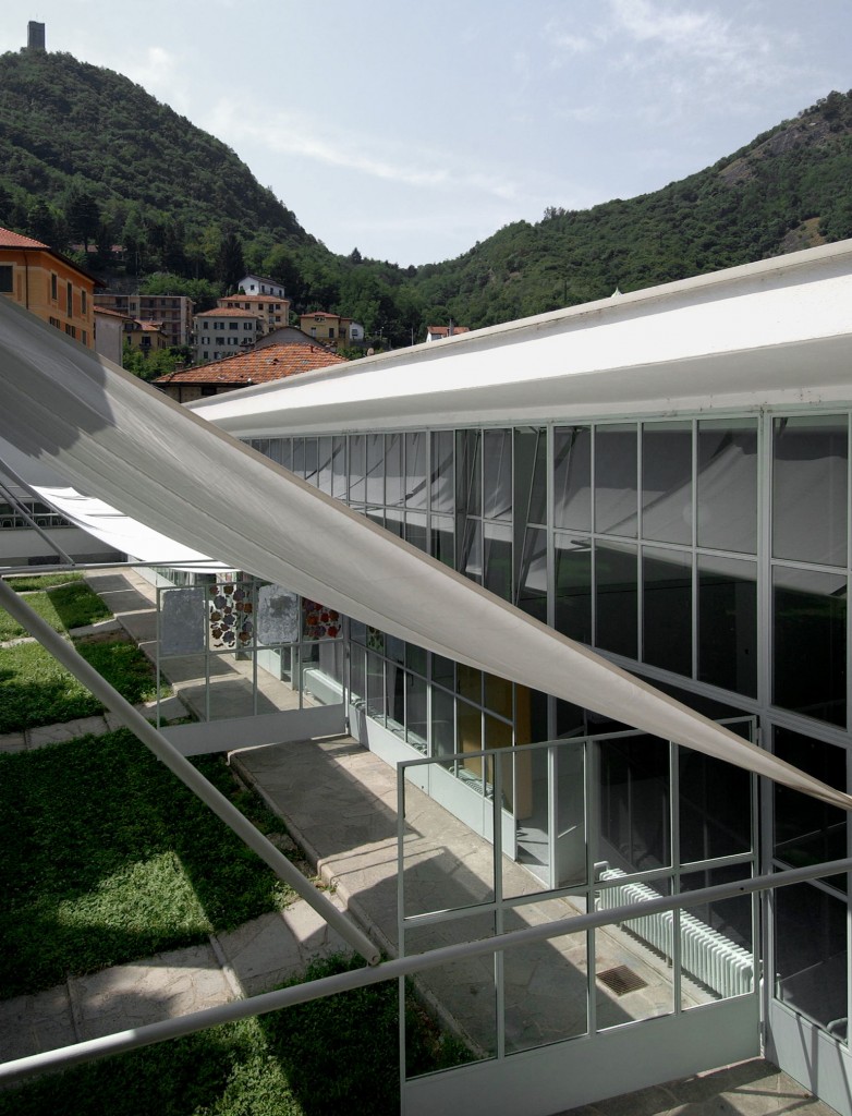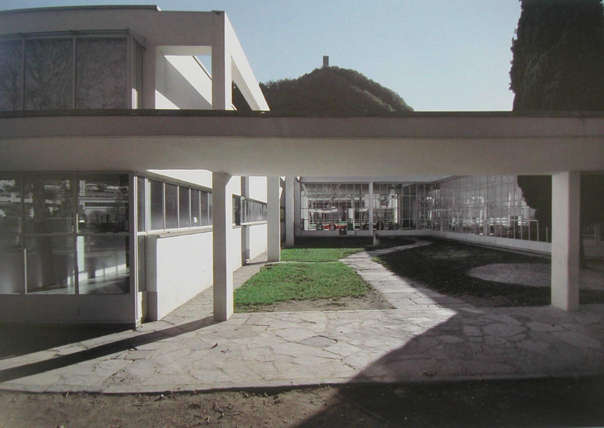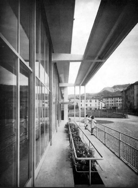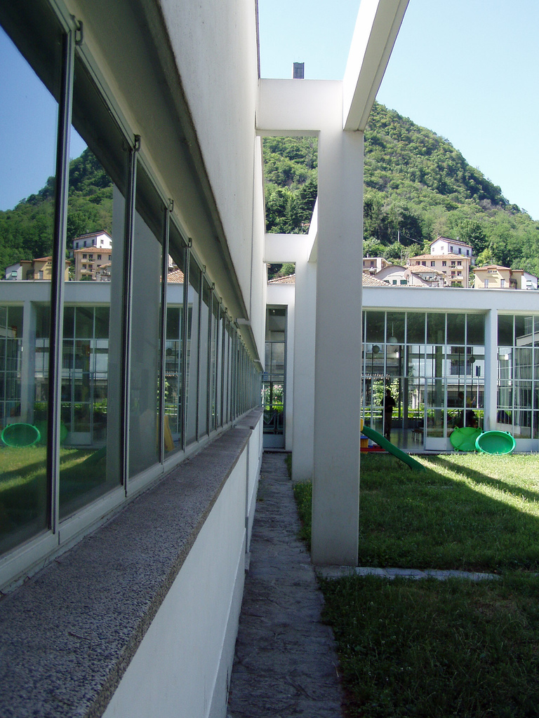 ..L'asilo condivide con la villa il ruolo indipendente che gioca il telaio, ma assume nel rapporto con la natura un nuovo accento. L'inizio è segnato dalla presenza, sulla strada, dello stesso telaio adoperato nella villa Bianca: un elemento antagonista al volume pieno, un pezzo di struttura sbilanciata nello spazio. Il telaio però non serve solo ad attaccare l'unitarietà del volume, a metterlo in crisi dinamicamente, ma è il prodotto della pressione esercitata dal giardino. È un segnale del cuore verde del progetto. E al giardino il telaio rimanda: nell'allineamento e nella medesima larghezza quindi nei reciproci traguardi visivi e nella preenza di una striscia di verde a