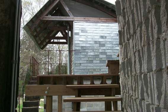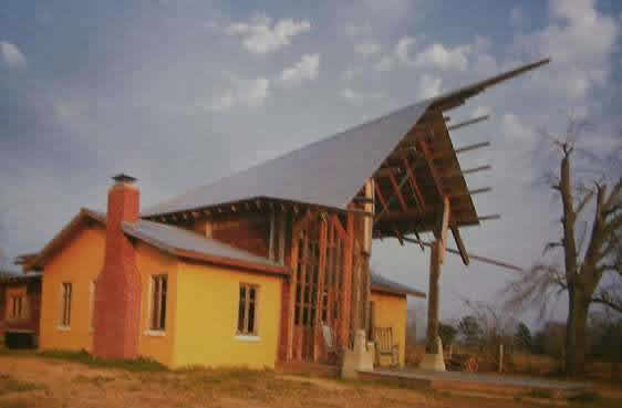 So, we are in the poorest region of the USA; and one thing that we understand just looking at the rural south is that there are parts of the USA that are exactly like Africa. I taught in Africa for many months, sixteen months, so I know Africa quite well. And then I can tell you there are levels of poverty in the US similar to what I found in Africa. This man is a teacher, his name is Samuel Mockbee. Some of you know him, probably some of you don’t know. Samuel Mockbee also had a dream: his was to do something in that poorest region of the USA, of Alabama. He was from Mississippi, and he chose the poorest part of Alabama to set up the Rural Studio. The Rural Studio is the realisation of his dream, and it is based on a very simple concept. Why should the student of a school of architecture not have to actually build and experience construction, to experience design and the actually realisation of it? A very simple and straightforward question. The second question is why, instead of doing these things on a grassy university campus, do we not do them where there is a real need, where there is real poverty, where we can be doing something useful? These are valid concerns, but what I want to point out here is that the result is beauty at its purest level. We are interested in Mockbee’s project not only for the excellent humanitarian reasons, but also because what is going on here is beautiful. What they are doing is reusing, in a very imaginative way, discarded materials obtained from donations. Carpets, for example, which in American office buildings are replaced every six years, can be used by Mockbee’s students as materials. Experimenting, studying, building, making it. What we are looking at here (17) are what they call pods (before the Ipod). These pods are places where single students lived, and they were near a large mansion. What we see here, for example, are licence plates that the State of Alabama didn’t use, which are being put to use as a kind of panel material. The bricks we see here that were all discards, which again are being put to constructive use.