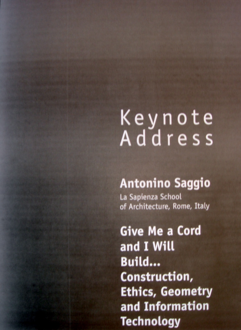 What I am proposing for tonight’s lecture is a review of different aspects of construction. I am going to start a little farther back in time and in the thinking, approaching the theme from quite a distance and not arriving at Information Technology until the second part of the talk. Then, in some way, we’ll start this kind of spiral way of thinking which is what I am going to present. So I will touch on different aspects – some quite superficially, others in more depth – but the links are there and can be followed. Of course the very title of this lecture – Give me a cord and I will build…Construction, Ethics, Geometry and Information Technology – should put you in a certain frame of mind. This is the best title that Maria and I were able to agree on.
