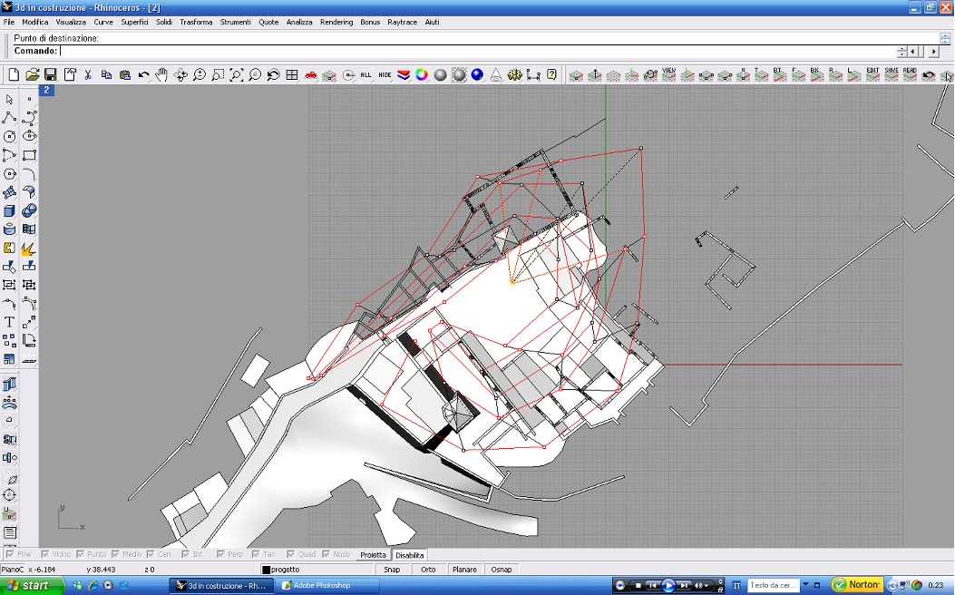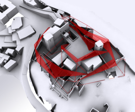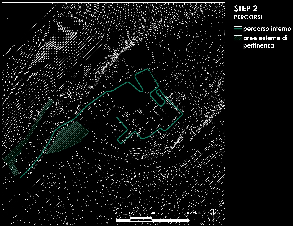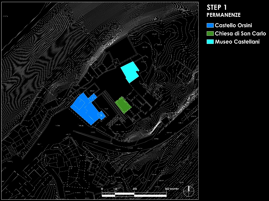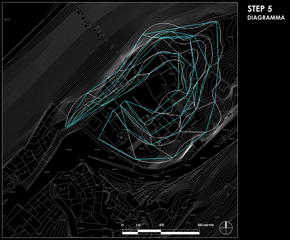 Un primo approccio ci ha portato all'idea di sovrapporre una griglia alla planimetria e deformarla seguendo l'andamento del terreno; ma ciò avrebbe portato all'imposizione di un qualcosa di artificiale per ill fatto che il tipico sviluppo dei borghi antichi segue il terreno e non è mai ortogonale.