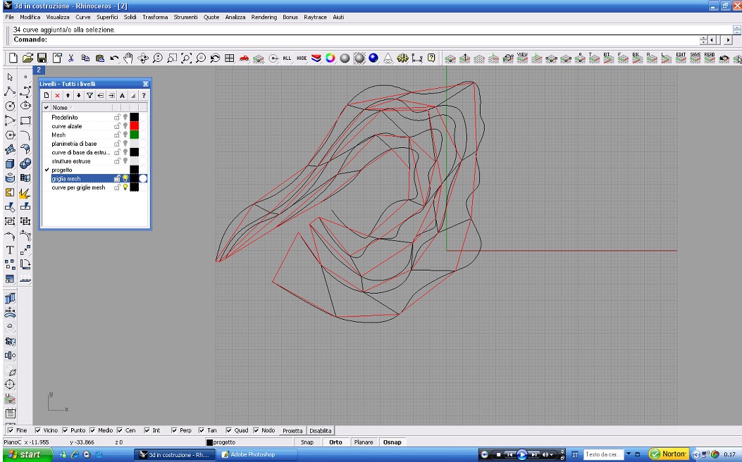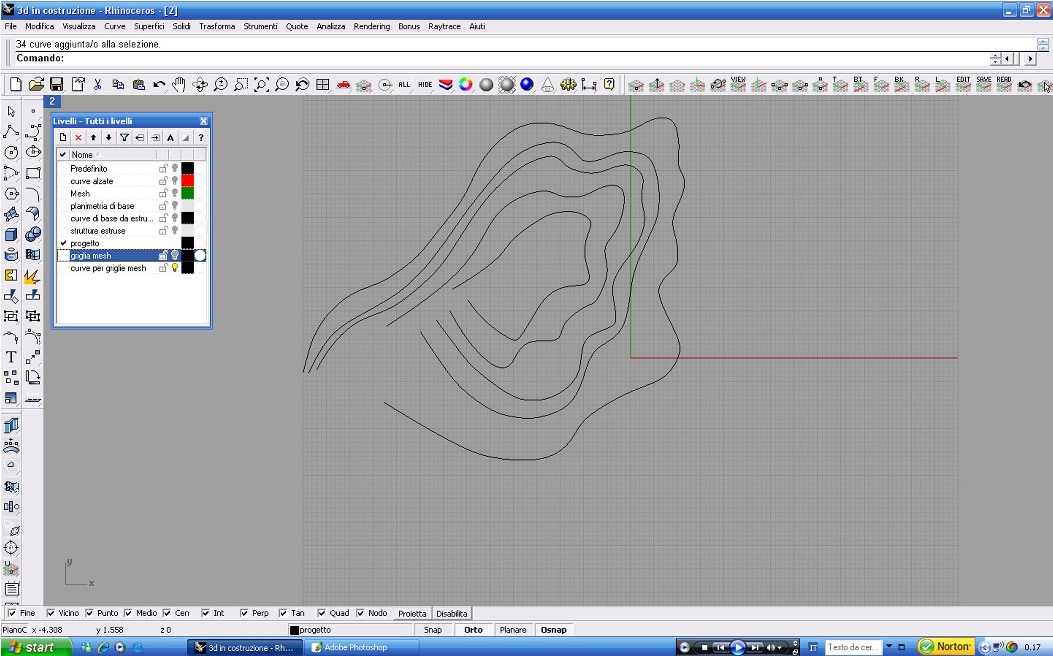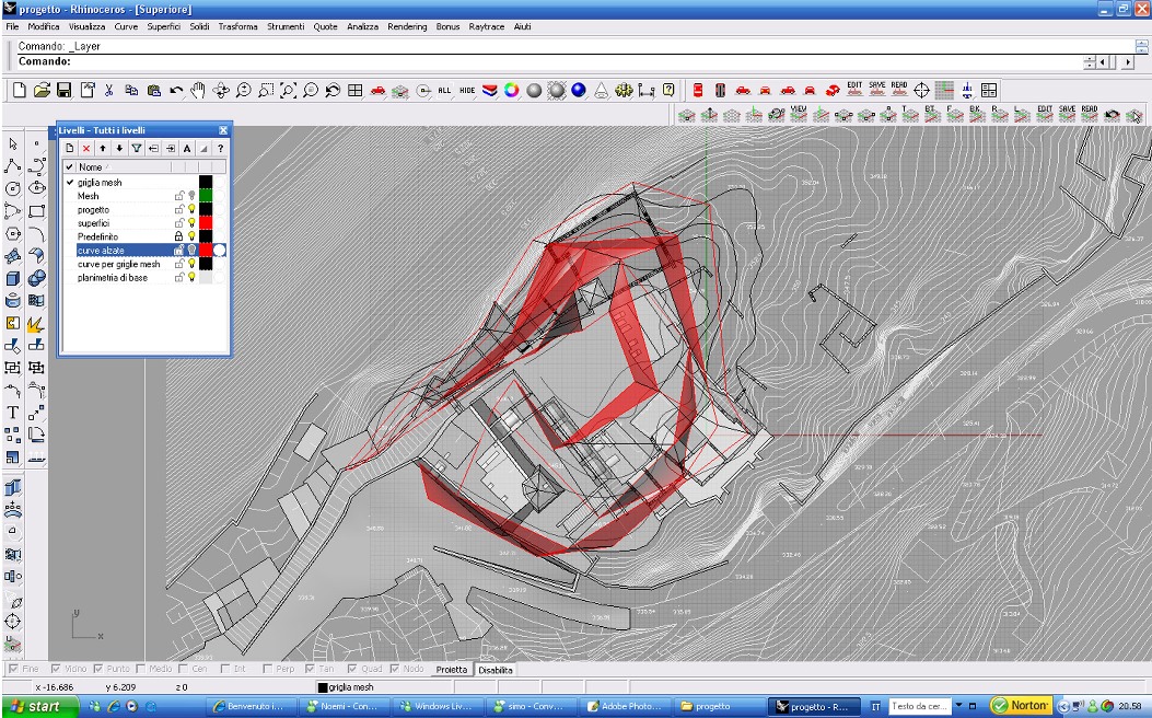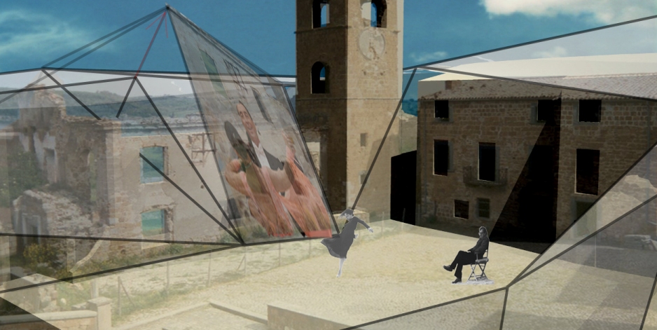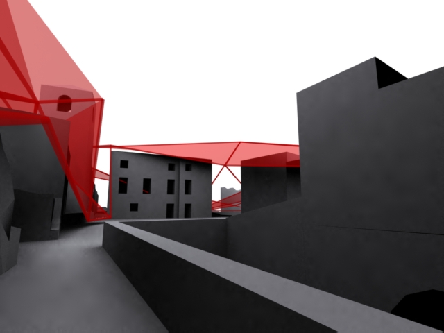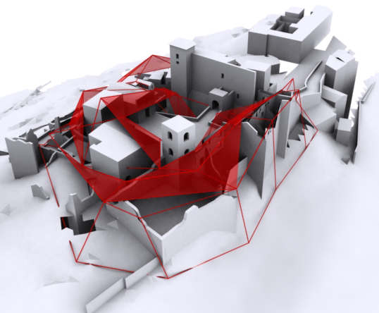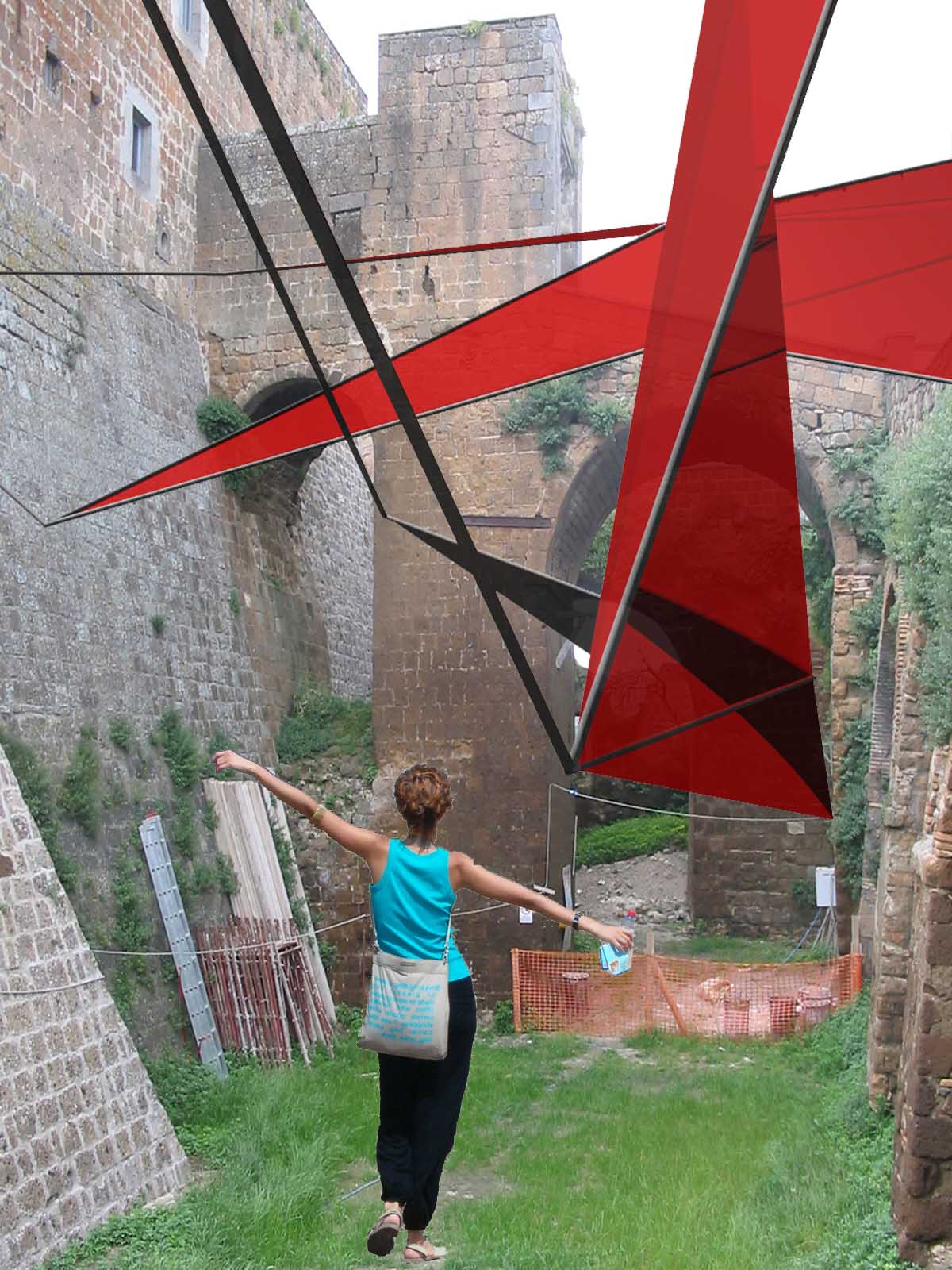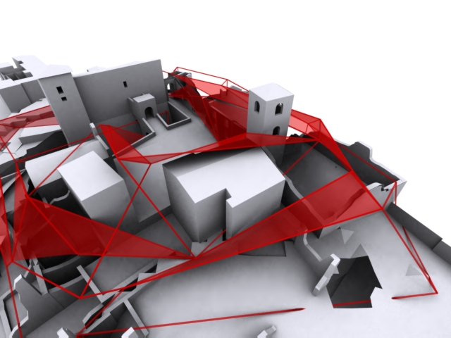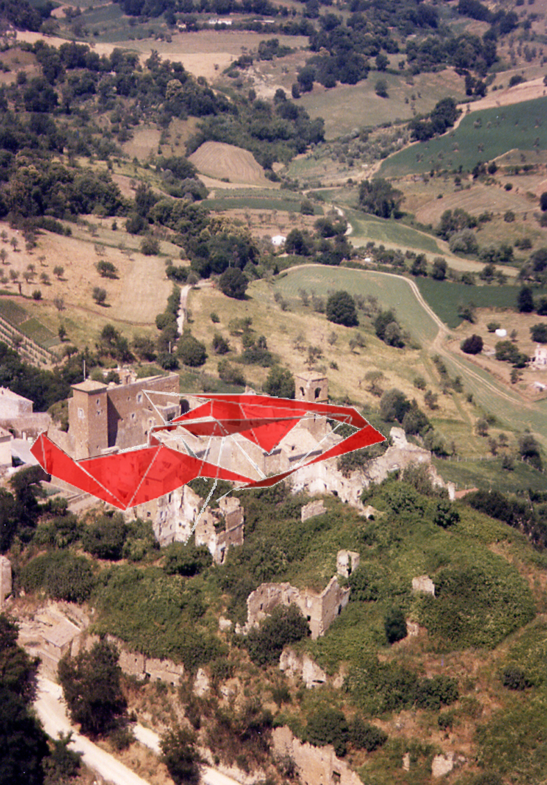 La seconda e definitiva ipotesi invece si basa su un procedimento inverso: abbiamo ricavato le curve di livello su cui il paese è stato costruito e le abbiamo trasformate in un diagramma, costituito interamente da triangolazioni (mesh). La griglia ottenuta segue l'andamento del terreno. Essa è modificabile per essere adattata alle esigenze funzionali (necessità di creare degli spazi coperti, delle strutture di sostegno, ecc...) spostando i punti-vettori sia in altezza che in piano. Tale operazione ha generato in alcuni punti delle superfici, a volte tele per proiezioni, a volte reti per la crescita di rampicanti, a volte coperture, creando una installazione a scala paesistica.