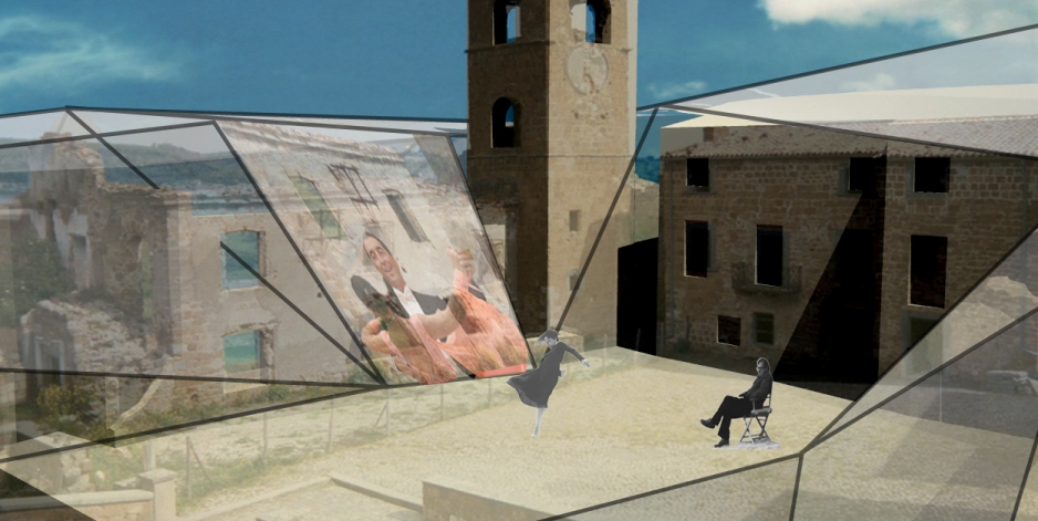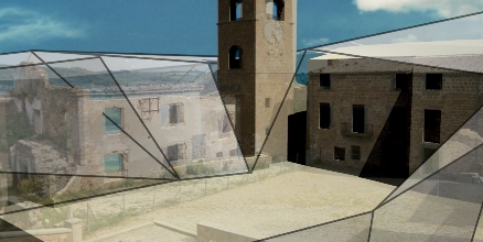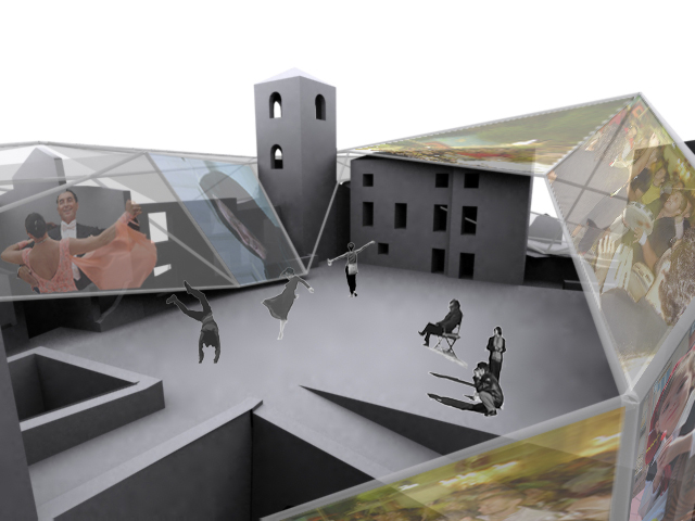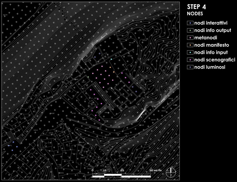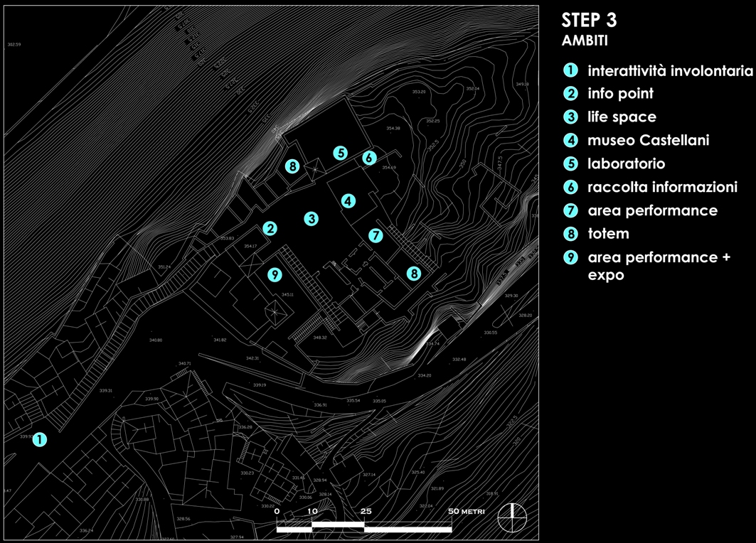 istallazione luminosa che proietta disegni di luce modificati a seconda delle informazioni raccolte relative alle attività che si svolgono nel paese  spazio aperto per ospitare le diverse rappresentazioni ed esposizioni delle opere eelle nicchie formate dalla base del castello