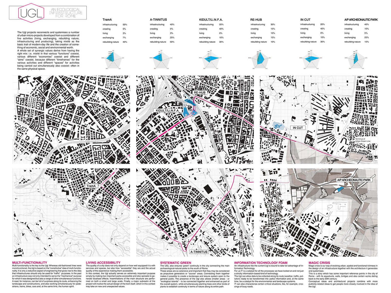 Alle cinque componenti fondamentali della strategia dei progetti di micro intereventi urbani nelle aree abbandonate della città denominati UrbanVoids (living, exchanging, rebuilding nature, infrastracturing e producing che interpretano la mixitè come caratteristica base del vivere contemporaneo), la UGL™ aggiunge altri cinque principi guida che si applicano al tema della infrastruttura e della mobilità. Sono: