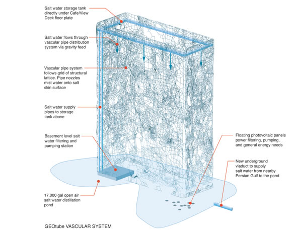 Geotube is a proposal from Berkeley-based Faulders Studio for Dubai (natch) that self-generates a salt-based skin with seawater. The building’s skin is entirely grown and is in continual formation rather than fully completed. The building sucks up water from the Persian Gulf through a 4.62 km underground pipeline, and then sprays it over its mesh facade. The water will evaporate in the hot Dubai sun, leaving behind crystallized salt deposits, transforming the tower’s appearance from transparent to a highly visible white solid plane. The building will be used as a specialized habitat for wildlife that thrives in this environment.