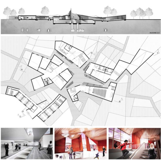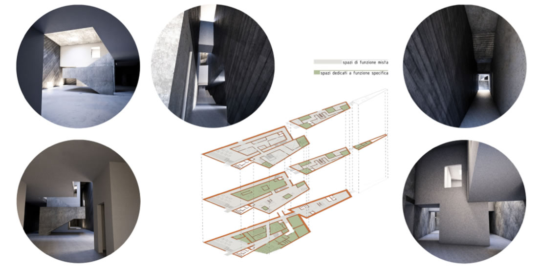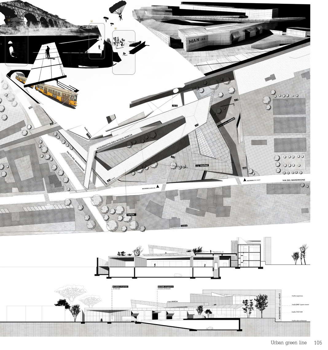 In una zona di Roma caratterizzata dall'intreccio di antichi acquedotti e dallo scavo del fosso della Marana, tra pressistenze archeologiche ed una edilizia spontanea accumulata negli scorsi decenni e oggi quasi fortificata nella sua stessa diversità, si incunea il Progetto del Labo: un Laboratorio per lo studio del Cinema neoralista a Roma. La zona del Mandrione infatti è fortemente legata all'immaginario neo realista e ben può accogliere una struttura con tali finalità. L'andamento planimetrico del progetto scava il terreno valorizzando il vecchio andamento del fosso della Marana e a questo si raffronta nell'andamento zigzagante. Gli spazi del Labo vivono di una voluta indifferenziazione tra interno ed esterno (uno dei temi cardine del neo realismo). Masse frammentarie aprano squarci e invitano a relazioni inaspettate, spesso caratterizzate da profondi coni di luce e ombra. Naturalmente il Labo innesta anche le relazioni e le tecnologie per un museo diffuso per la conoscenza dei luoghi e della cultura del neorealismo a Roma attraverso le moderne tecnologie. In particolare, collocandosi accanto alla Urban Green line, ne costituisce uno dei poli di arrivo, ma anche di ripartenza per la conoscenza dei luoghi del neorealismo in questa parte della città. Il Labo così diventa uno dei punti di attrazione della nostra Roma futura, apparentemente impossibile oggi, ma per noi necessaria comunque.