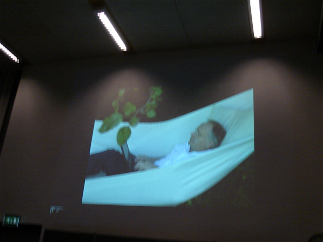 John Frazer, Gehry technologies, che lavora nella sua amaca con i collaboratori in aereo. Foto presentata dallo stesso frazer alla TU Delf aprile 2006, cosi come le altre due che seguono