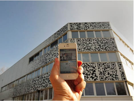 "Questo modo di fare architettura informando è stato preso alla lettera anche dal gruppo olandese MVRDV con il loro TeleTech call centre. In questo caso hanno sfruttato la tecnologia del QR codes, riproducendoli in facciata, qualsiasi persona in possesso di uno smartphone può scansionare ognuno dei qr codes ed accedere alle informazioni a cui essi rimandano. Essendo questa una tecnologia molto diffusa, "