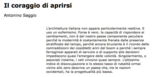 B. Aggiornare o Scrivere nel vostro sito una seconda eidzione Concept TEVERE CAVO che gia avete fatto dopo la lezine attraverso una reinterpretazione, un'idea un suggerimento che può essere derivato dalla lettura del testo di cui avete fatto la recensione, oppure dalla lettura del volume Introduzione a la Rivoluzione Informatica in Architettura che immagino tutti stiate leggendo parallelamente allo sviluppo delle lezioni, oppure rispetto ad altre considerazioni ed esperienze. Tecnicamente si tratta di due o tre paragrafi al massimo che dovrebbero già avere un titolo (concettuale) e un sottotitolo (esemplificativo). Potete anche scorrere le esperienze dei corsi 2006 -2014 sia nella sezione finale >>, sia in quella delle presentazione intermedie per attivare alcune riflessioni ulteriori. Il concept inziale verte specificatamente su una situazione di CRISI o al Contrario su un forte DESIDERIO. Riflettendo in questi giorni sul tema delle crisi pensavo che un grande patrimonio di crisi aperte in ITALIA sono quelle delle condanne che havuto l'Italia da parte delel UE.. Magari ci danno uno spunto interessante!!!! Questo è solo un primo link.. approfondendo sono sicuro se ne possono trovare di interessanti