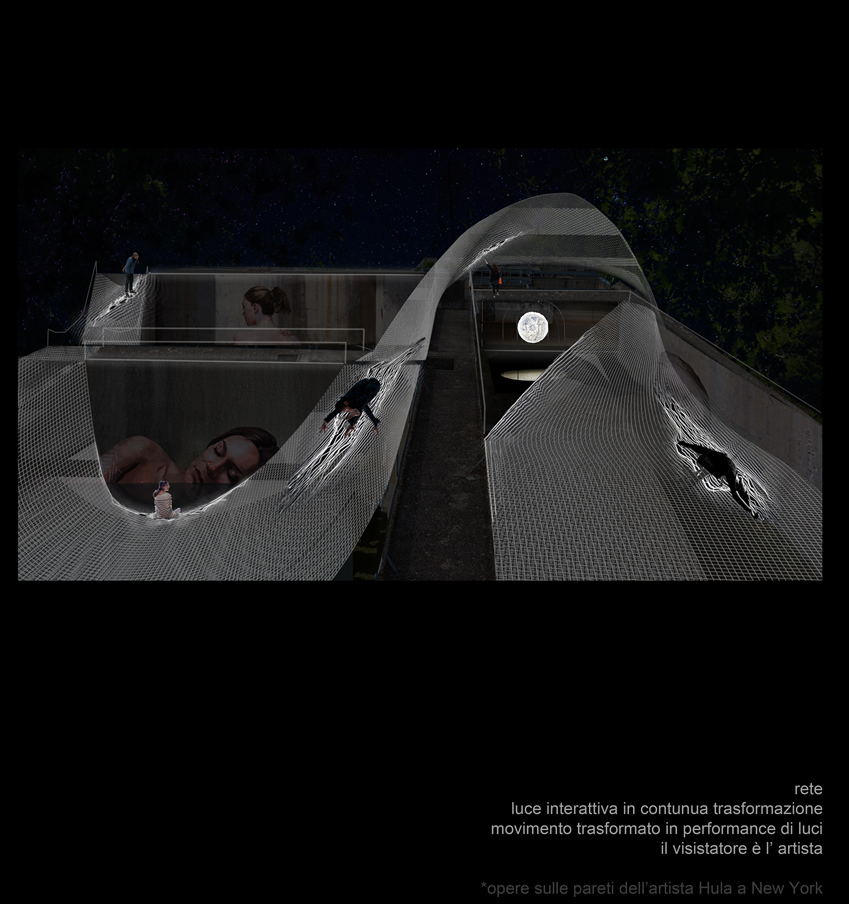 La proposta di istallazione al Maam si concretizza nell'estensione del museo verso gli spazi aperti, in particolare là dove l'acqua un tempo era l'elemento purificante del salumificio: le vasche. Oggi la immaginiamo "scorrere" con dei salti tra una vasca e l'altra e disegnare curve che si avvolgono in grandi "onde" cariche di energia e forza vitale. Un percorso dalle sinuosità cangianti poiché disegnato da una rete elastica la quale si illumina e cambia forma nell'interazione con il visitatore e al tempo stesso ne modifica la visuale. L'osservatore/abitante, coerentemente con l'arte contemporanea, diventa protagonista assoluto e, come una molecola d'acqua in movimento, scivola seguendo le curve, finisce nell'onda, ne riaffiora, si guarda intorno, può giocare con la luce, può godere di opere d'arte posizionate in punti strategici o semplicemente prendersi un po' di relax e, se nel frattempo giunge la notte, può incontrare la luna e dialogarci!