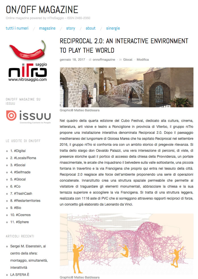 Nella città di Ronciglione il 6, 7 e 8 Dicembre 2014 si è svolto il Cubo festival. Il centro antico della città sul lago di Vico ha visto installazioni, performance, eventi. In questa occasione il gruppo nITro è sceso letteralmente in piazza con un atto pubblico: quindi politico, quindi sociale. Ha esposto il lavoro dell’architetto Dario Pompei, redatto come tesi di Laurea con il prof. Antonino Saggio a “Sapienza” e ha costruito attorno a questa presenza una azione che è stata spaziale, ambientale, tecnologica e, appunto, politica. Il progetto ha dimostrato come si può affrontare la grave crisi dell'inquinamento da veleni che ha investito il lago di Vico. L'operazione prevede ad un tempo una riforestazione attiva, la decontaminazione e la bonifica e la creazione di percorsi pensili su passerelle in legno. Questi percorsi valorizzano questa zona delle pendici del lago con delle micro architetture inserite nel contesto che consentono uno sviluppo compatibile con le vocazioni naturalistiche dell'area.