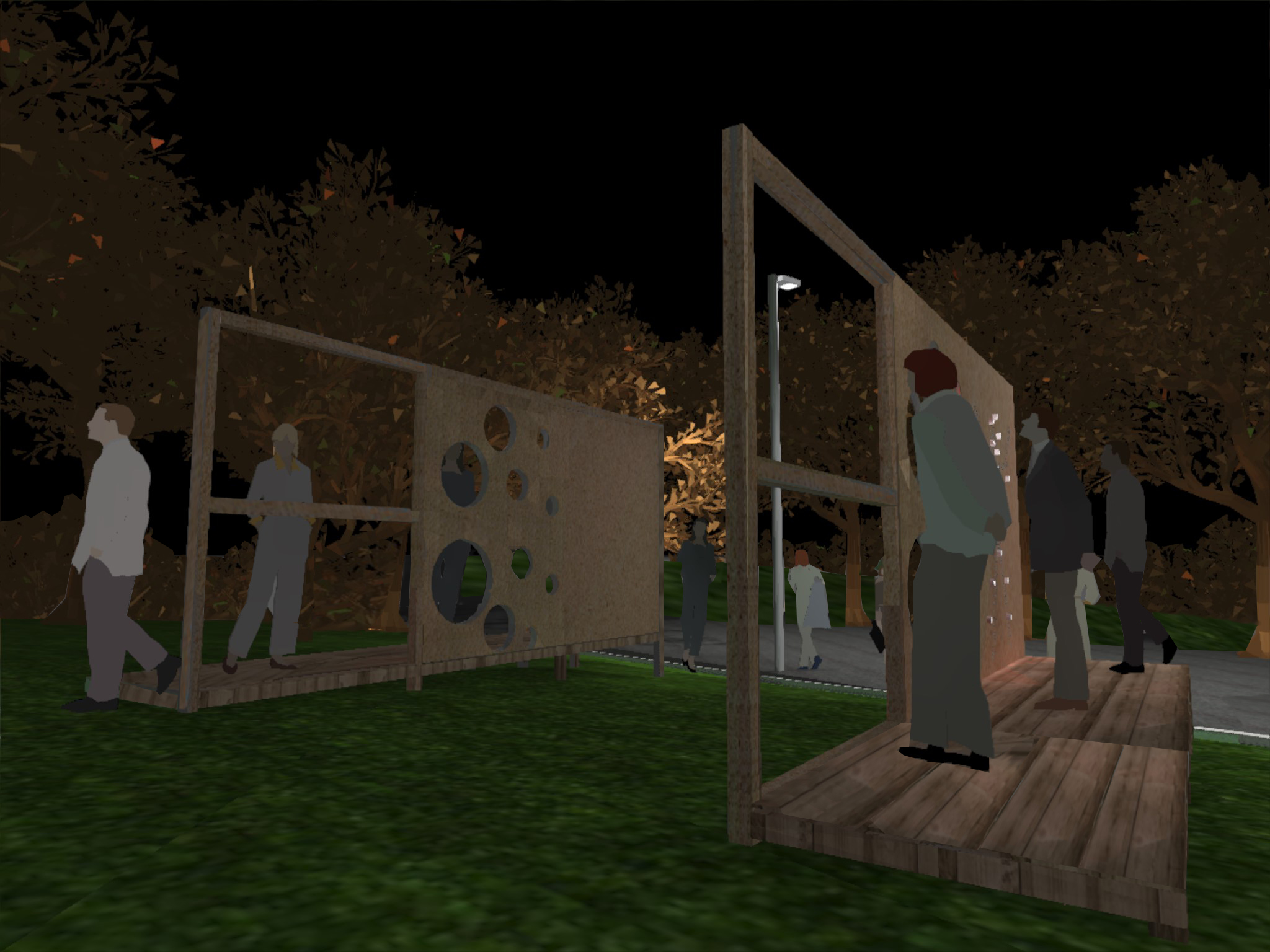 Le informazioni passive non rimangono impresse… per cercare di cambiare questa realtà abbiamo pensato ad una istallazione attiva: questa nasce e si trasforma solo grazie alle persone. Un enorme foglio bianco diventa la tela di tutti coloro che vogliono prendere parte a questo progetto, dipingendo e divertendosi attivano non solo un processo di trasformazione dell’opera ma accendono l’informazione! Grandi scheletri esagonali costruiscono uno spazio sempre nuovo. Alcuni potrebbero avere un lato chiuso da un pannello informativo, che illustrerà una delle diverse problematiche che abbiamo rilevato all’interno del quartiere, e degli oggetti che cerchino di risolverlo al livello “micro”. Altri verranno lasciati completamente liberi. Tutti però, se spostati, coloreranno la tela su cui si posano. Piccoli esagoni, invece, saranno gli oggetti di scena di questa istallazione: sono in grado di diventare sedute, se uniti possono costituire un tavolino o un palco, possono essere un’istallazione artistica o, addirittura, un landscape. E infine anche loro saranno in grado di colorare la tela che fa da pavimentazione a tutta l’opera, grazie a grandi cuscinetti imbevuti di inchiostro colorato che trasformeranno questi elementi in timbri..