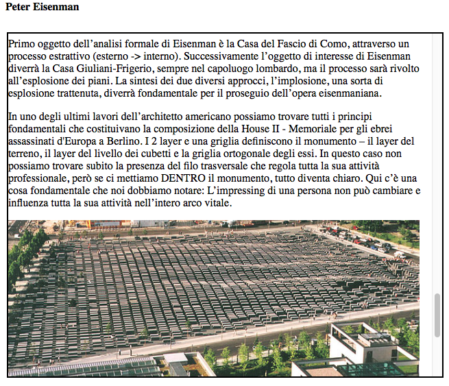Marta Gioffrè ITCAAD 2014 discute dell'articolo..che è stato pubblicato originariamente nel lontano 1993 su Domus : Antonino Saggio, recensione a Peter Eisenman, di Pippo Ciorra, in "Domus", n. 751, luglio-agosto 1993, pp. I-II. La questioone è almeno per me rilevante. Infatti a chi legge l'articolo dopo il libro (del 1996) scoprirà che spesso i miei articoli contengono in nuce un libro. In moltissimi casi non l'ho scritto "dopo" il libro, nel caso di Eisenman si.
