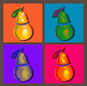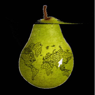 * "La silhouette del frutto ricorda una lampadina. Da sempre la lampadina è associata al concetto di idea e quindi di nuova informazione. Utilizzando la pera come metafora della lampadina si dà per assunto che la pera è idea e quindi informazione. La pera passa da uno status di spenta, quindi mancanza di informazione, ad essere accesa, quindi propria di un’informazione.