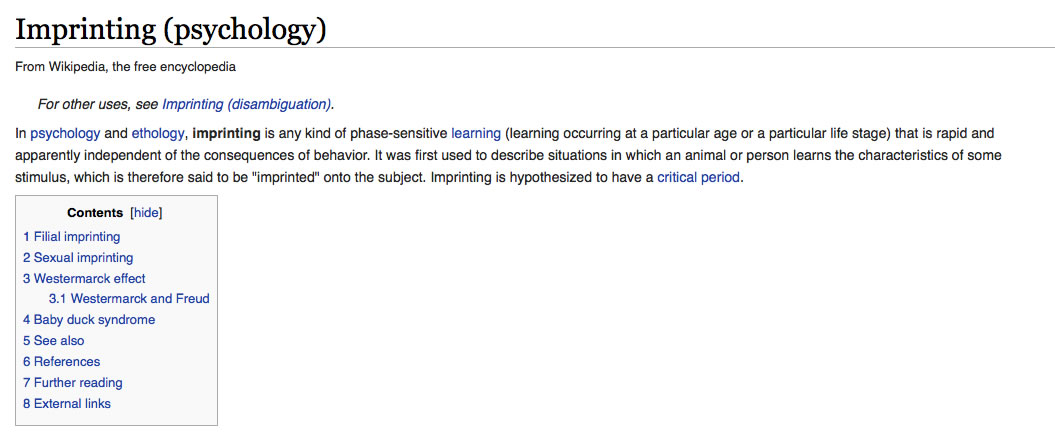 Imprinting - in etologia e psicologia è la forma di apprendimento di base, che si verifica in un periodo della vita detto periodo critico quando si è predisposti biologicamente a quel tipo di apprendimento. I primi studi sull'imprinting vennero fatti da Konrad Lorenz su delle oche: egli studiò come esse subito dopo la nascita identificano la propria madre nel primo oggetto o persona in movimento che vedono." Da Wikipedia Italia
