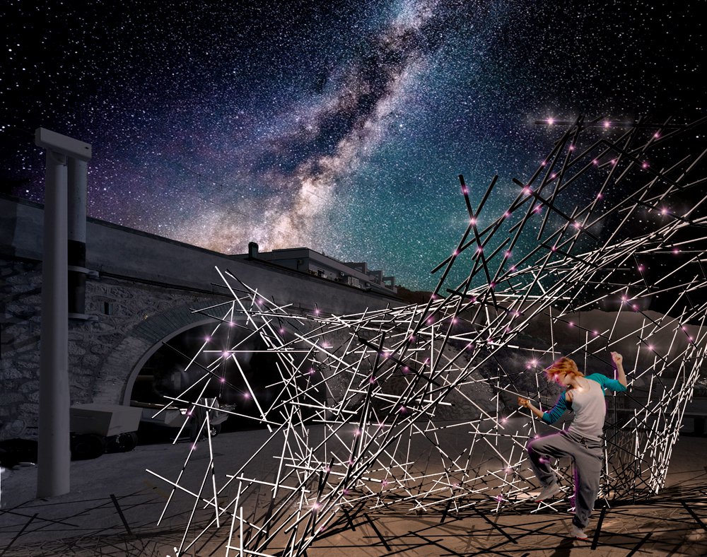 Grazie all’amministrazione comunale il belvedere è stato ripulito, gli elementi di arredo ripristinati e lo spazio è diventato pronto per l’arrivo di Reciprocal. Per la creazione dell’opera, il Nitrogroup ha lavorato alla creazione di uno script (in Grasshopper™ un applicativo di Rhino™) e poi di un prototipo in scala ridotta. Reciprocal è un progetto parametrico che offre la possibilità di ideare una architettura e poi affidare al programma informatico tre fasi fondamentali. La prima è quella statica. La struttura immaginata è posta a verifica con un modulo di statica (Kangaroo™) che la modifica un poco per renderla ottimale.