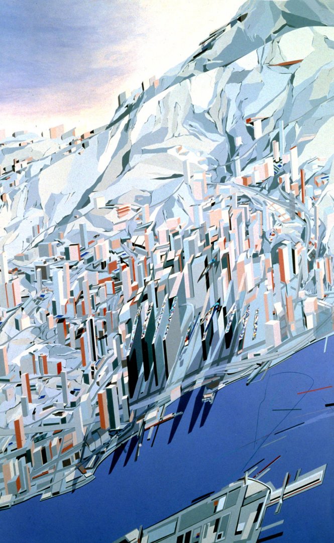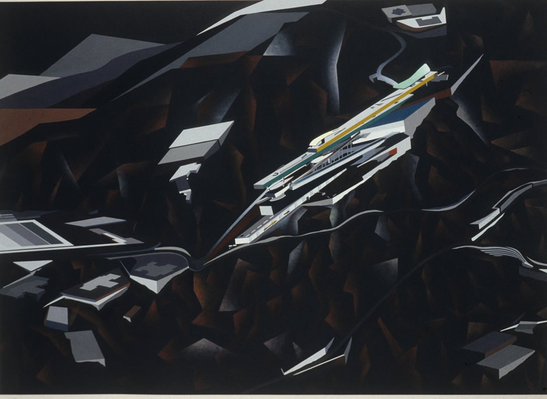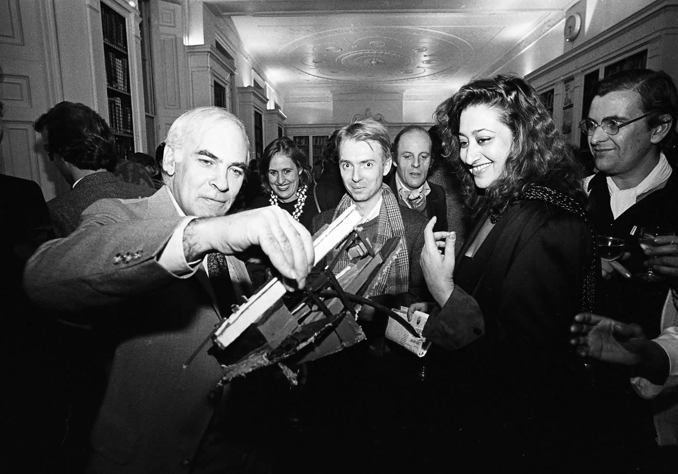 Alvin Boyarsky and Zaha Hadid at the Architectural Association, during a celebration for Zaha Hadid’s Peak Leisure Club project, 1983