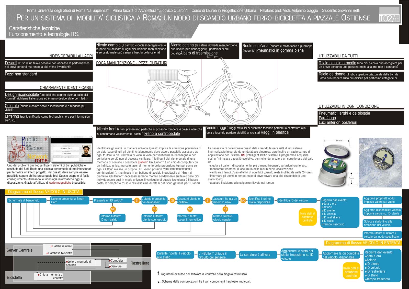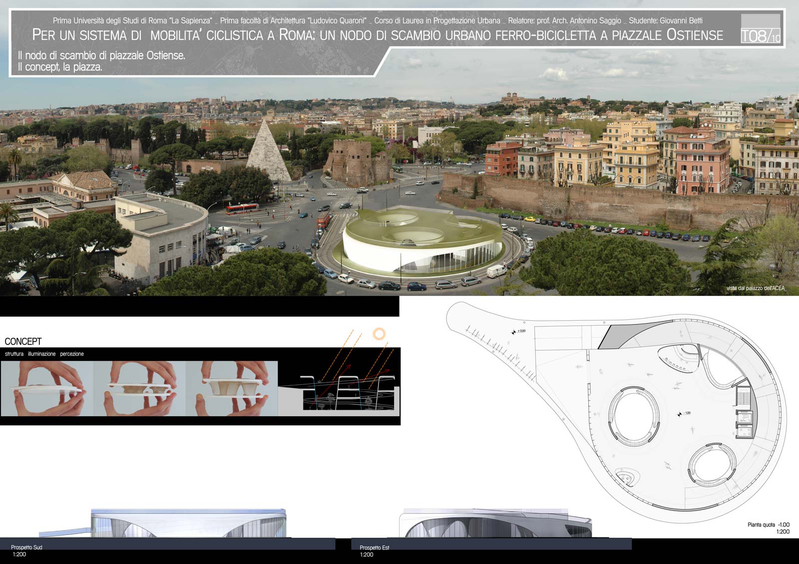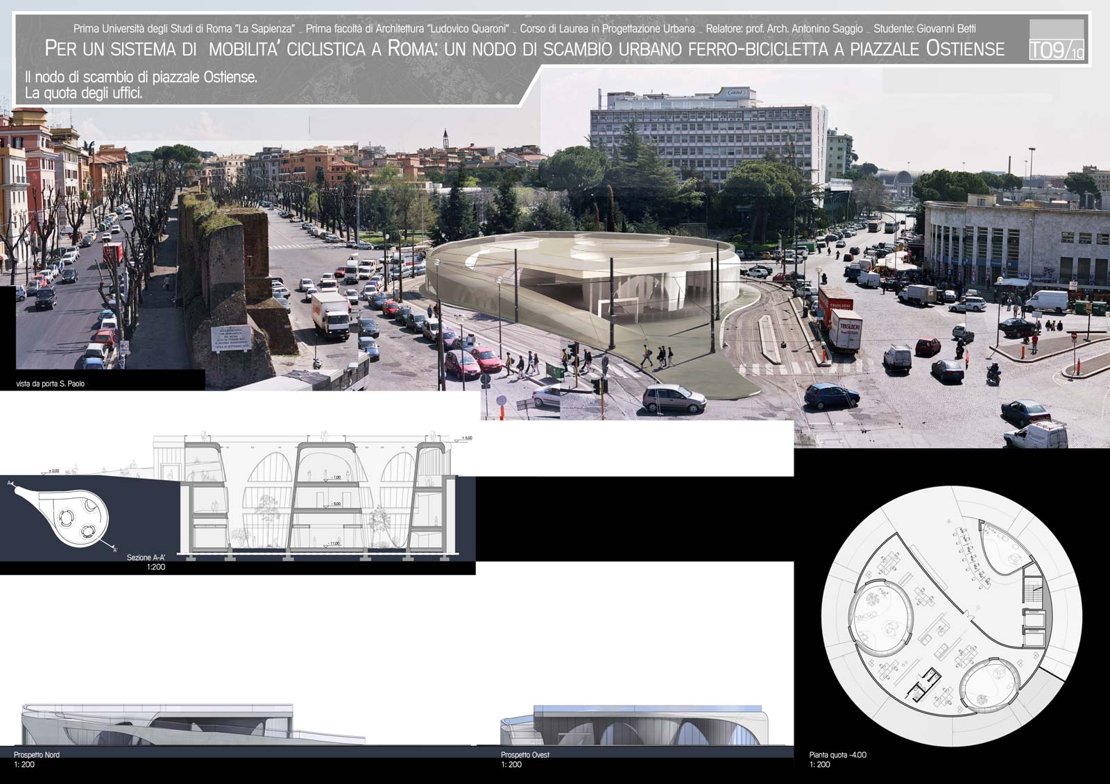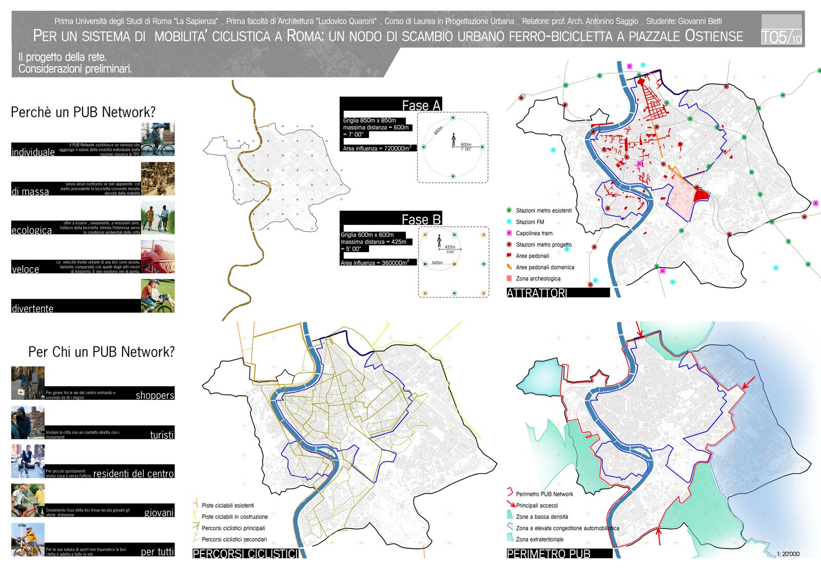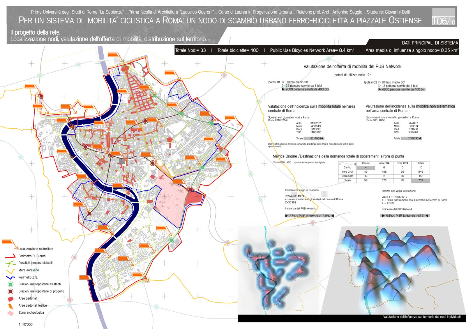 La tesi propone per la città di Roma un'idea aggiornata sulla base delle più avanzate esperienze internazionali di servizi di bici pubbliche. Il sistema proposto  si basa su una localizzazione di circa 40 rastrelliere disposte a maglia nella zona a traffico limitato della città e nelle sue immediate adiacenze. Il sistema studiato denominato PUB (public urban bike) si basa su un sistema computerizzato in cui l'utente è registrato così come la bicicletta. Il costo del noleggio è gratuito per un arco di tempo di un'ora circa e poi molto basso. In prossimità di un nodo internodale di grande rilevanza della città, la stazione Ostiense presso Porta San Paolo, il progetto sviluppa un edificio di mixitè che ruota attorno alla presenza della bicicletta. L'edifico è completamente percorribile su due ruote inclusa la terrazza panoramica in copertura e i due livelli sotterranei di cui l'ultimo collega l'edifcio alla stazione della metropolitana limitrofa. L'edificio si caratterizza per funzionali commerciali di manutenzione e culturali legati al tema delle bicicletta e per gli uffici centrali dell'organizzazione  che provvede al servizio. L'architettura dell'edificio è di particolare interesse. Un edificio a forma circolare si insedia all'interno di una piccola piazzola circondata da rotaie del tram. Tre grandi forature della superficie fanno penetrare la luce sino ai livelli più bassi e permettono di avere luce e verde dentro l'edificio. La struttura accompagna lo spazio con un sistema ogivale continuo di supporti a cui si appoggiano ai diversi livelli un solaio continuo. La forma pura, e allo stesso modernissima, crea un dialogo convincente con le forma pure dell'immediato intorno. La piramide Cestia, la stazione Ostiense, le poste di Libera e Vaccaro l'edifcio alto dell'Acea sulla piazza accolgono il nuovo edificio come un compagno naturale della scena urbana. L'esito architettonico  è frutto di numerose e integrali alternative sondate dal laureando  direttamente in tre dimensioni come le tecnologie di oggi consentono. Il costo della implementazione dell'intero sistema della mobabilità su due ruote proposte del progetto ( 400 biciclette e 40 rastrelliere in vari punti della città)  ha il costo di un solo autobus.